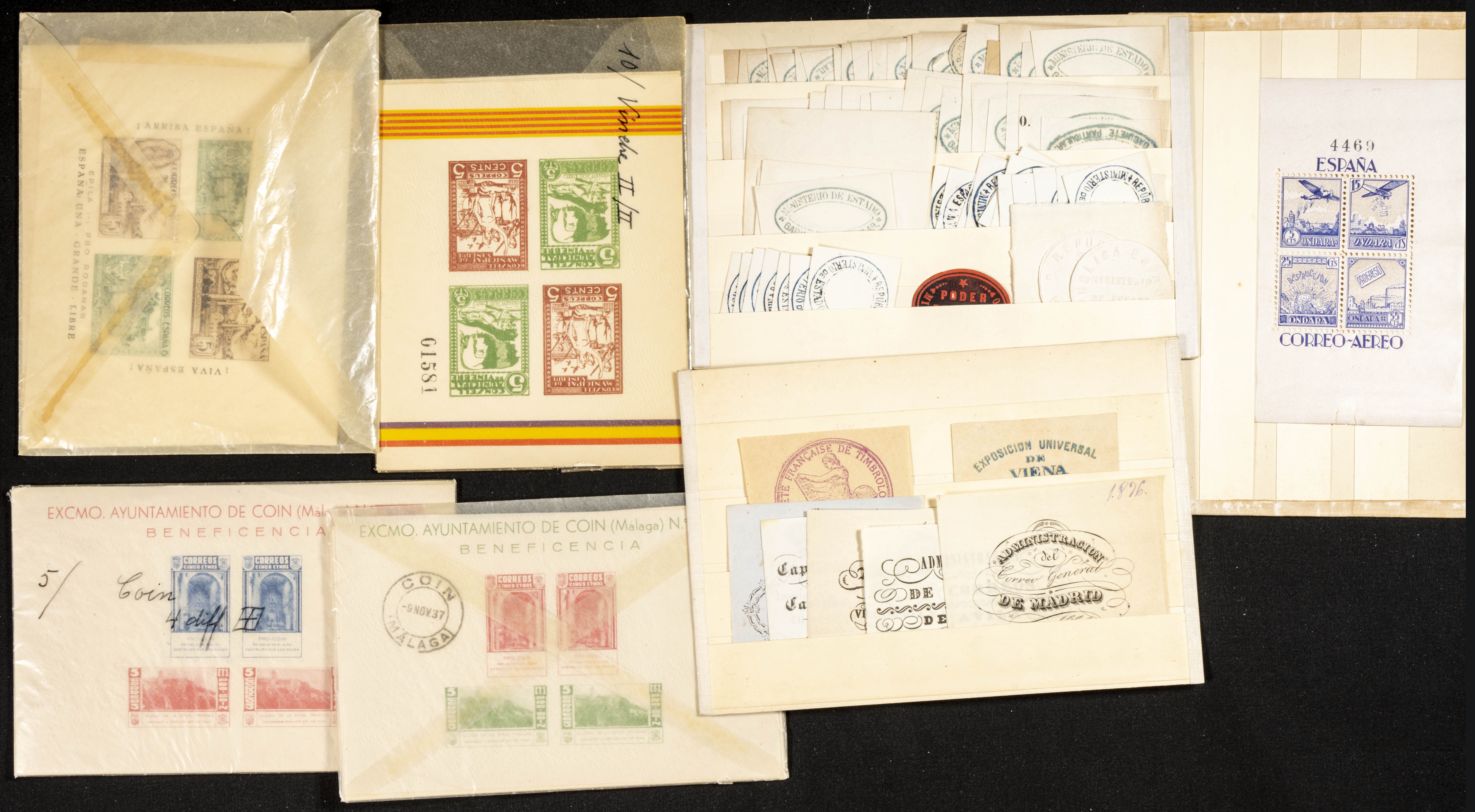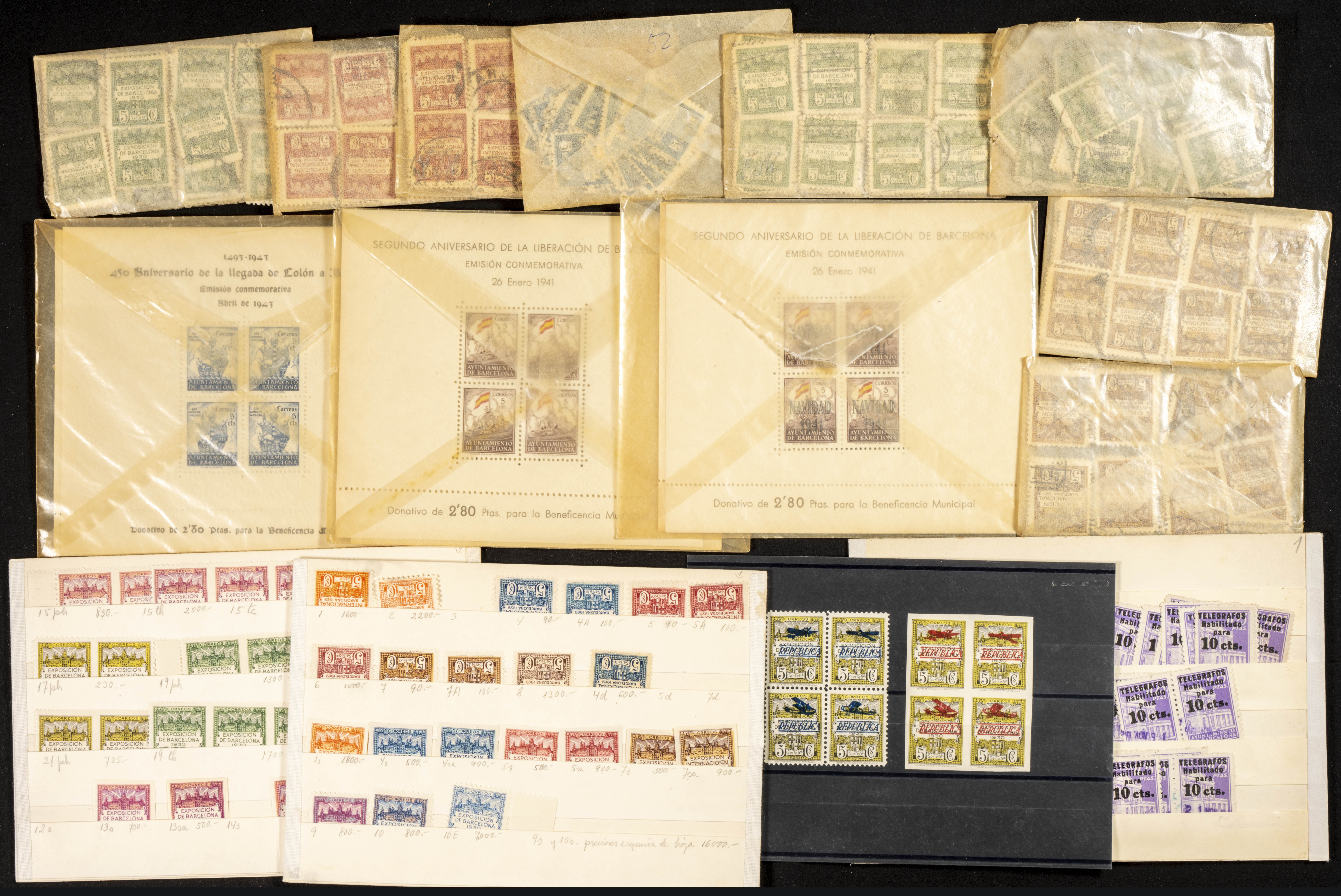English ★★/★1929. Interesting set of varieties from the first issue of the Barcelona City Council, new and including imperforate stamps, single-colour, pairs, trios, etc., as well as some later issues with block sheets, dozens of 10 cts stamps over 11.25 pts of new and used Telegraphs, several Local Charity sheets of Ondara, Coín, Epila and Vinebre and several cut-out state letterheads. HIGH CATALOGUE VALUE. WORTH EXAMINING.