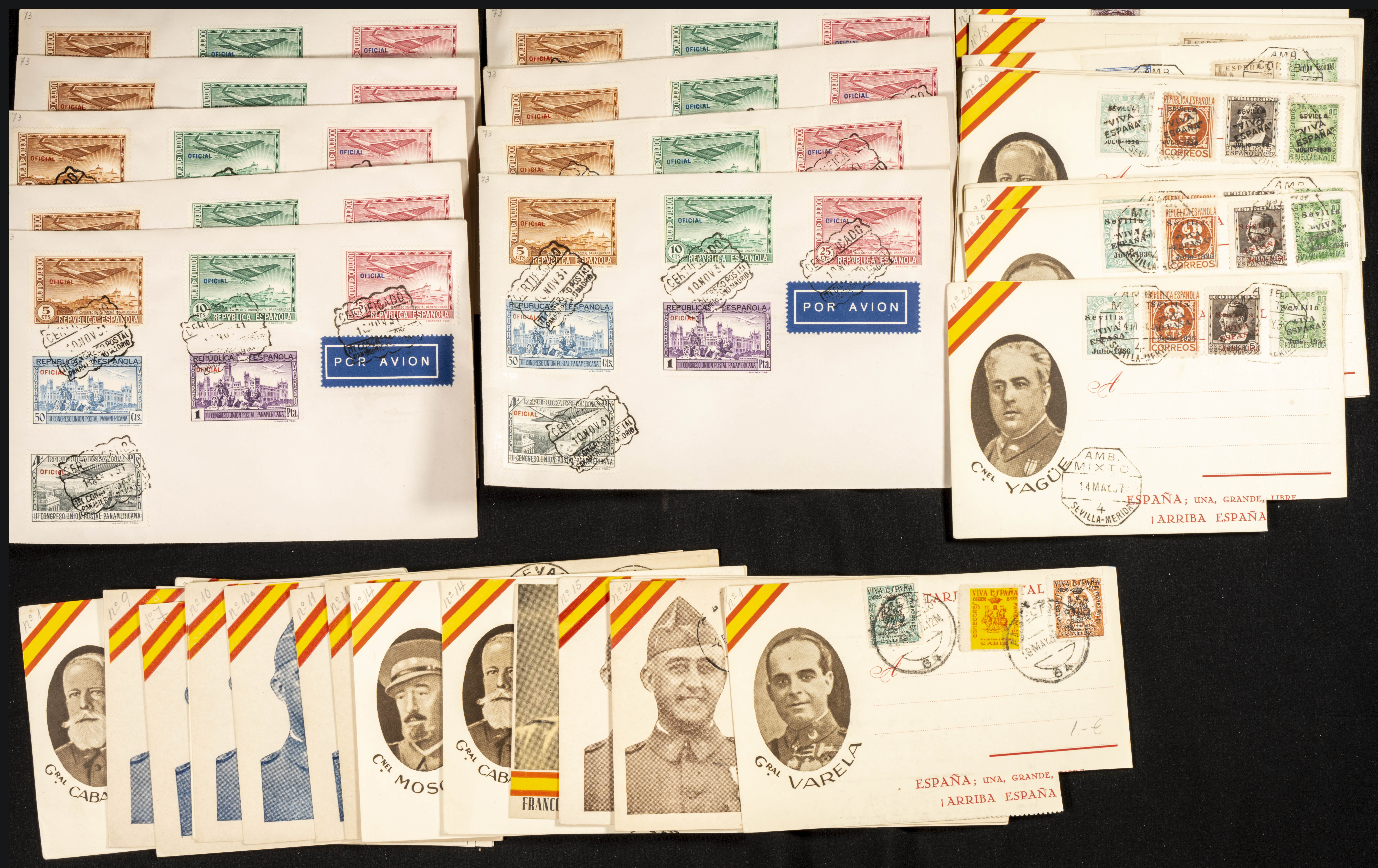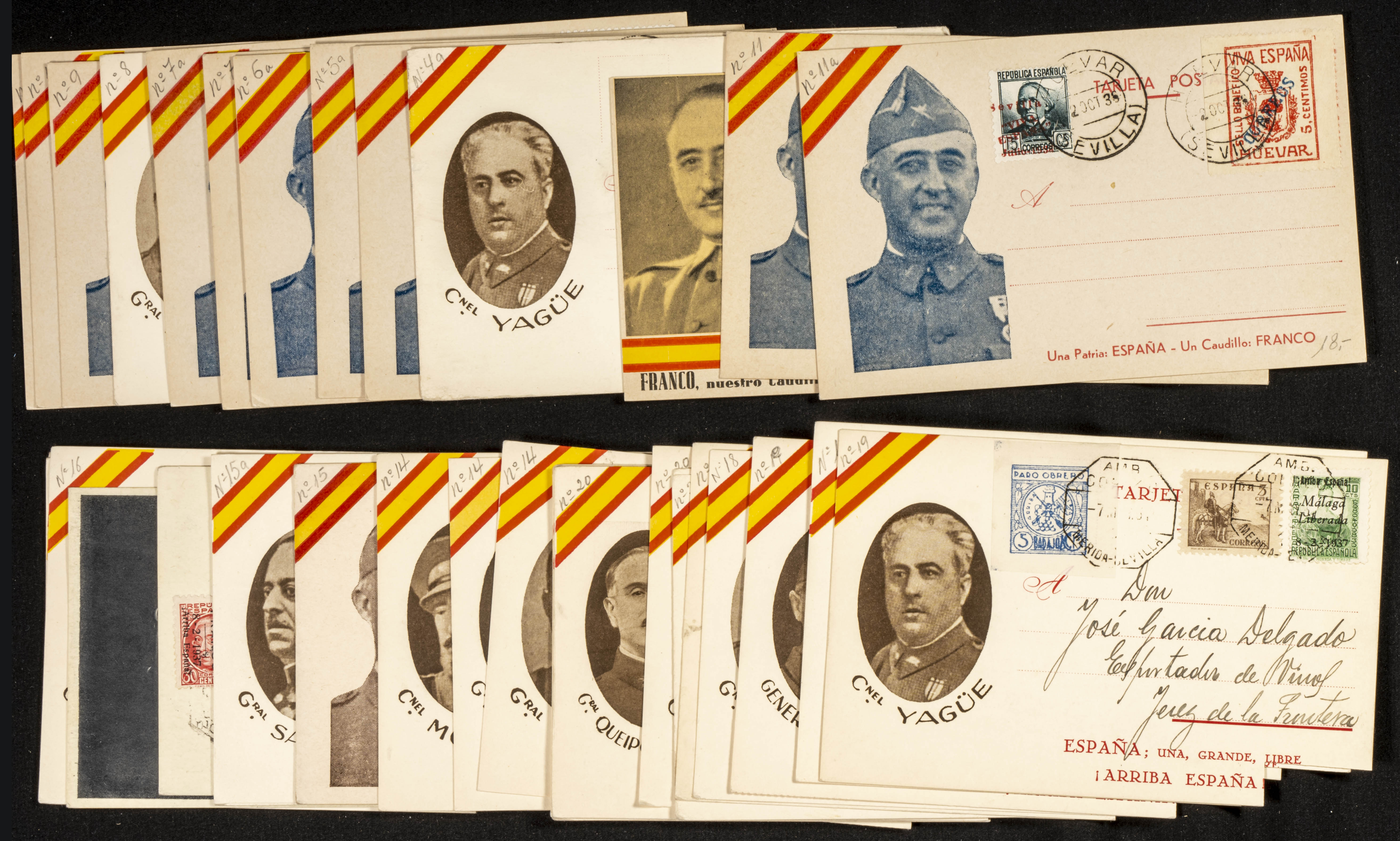 English (1936ca). Interesting set of more than seventy Postcards of Nationalist Characters (some with corner cutout) stamped with Local Patriotic Issues stamps from various provinces such as Seville, Cadiz and Malaga, some with varieties and includes eleven uncirculated letters with the official air series of the Pan American Postal Union. TO BE EXAMINED.