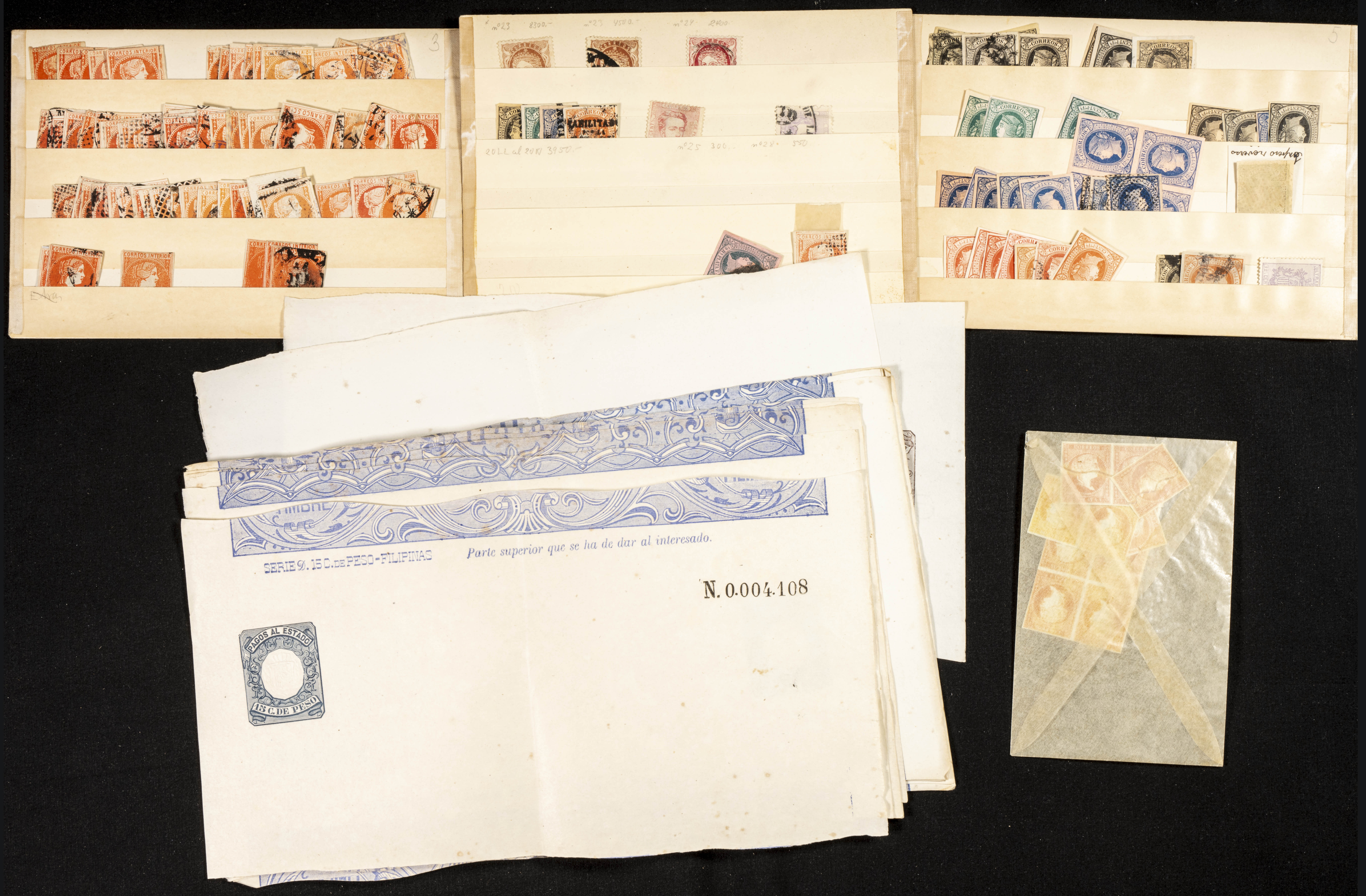 (1858ca). Interesting set of stamps from the Philippines between 1858 and 1878, used (some new) with some repetitions, including several stamps from the Antilles with Philippine postmarks, as well as dozens of new and used stamps AUTHORIZED BY THE NATION and sixteen matrices of fiscal payments to the State of the Philippines. VERY HIGH CATALOG VALUE. WORTH EXAMINING.
