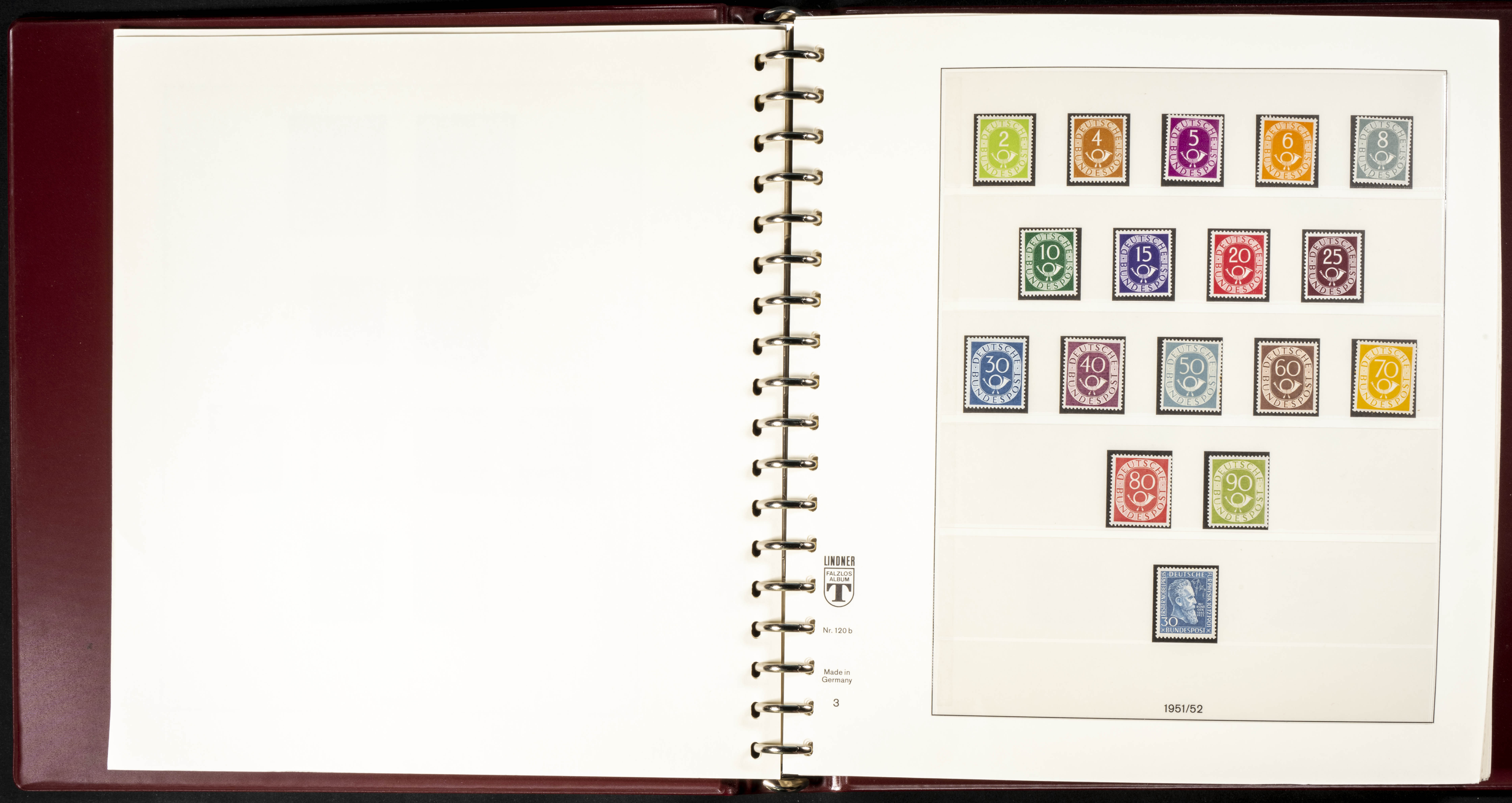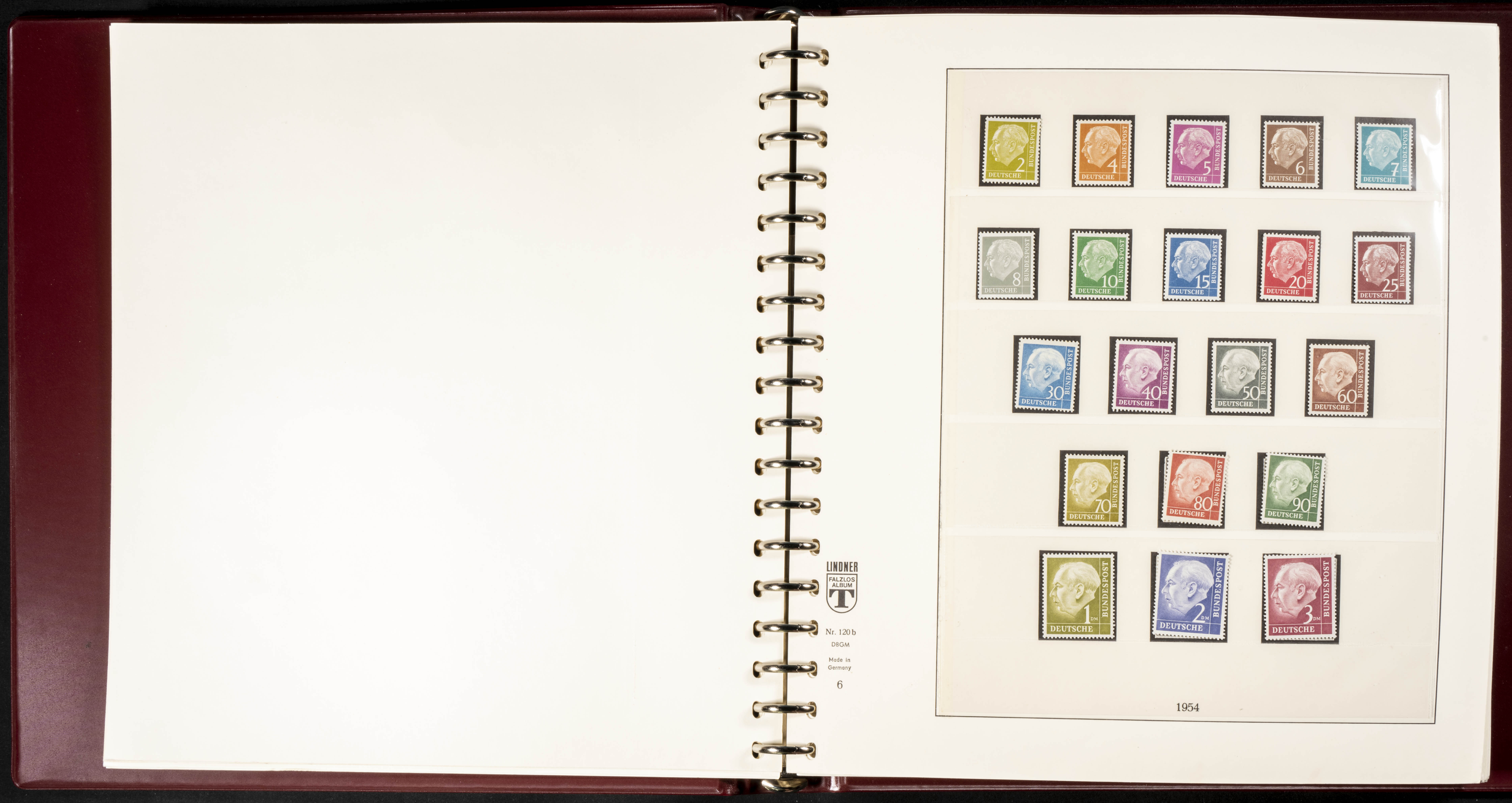 ★★/★(1949ca). Interesting and practically complete collection of West Germany (FRG) between 1949 and 2003, in new condition and with all the series from the beginning (Cornets, Heuss, etc.), most of them with hinges up to 1960, including numerous booklets, pairs and blocks from them and mini-sheets (mounted in Lindner albums). VERY HIGH CATALOGUE VALUE. ESSENTIAL TO EXAMINE.