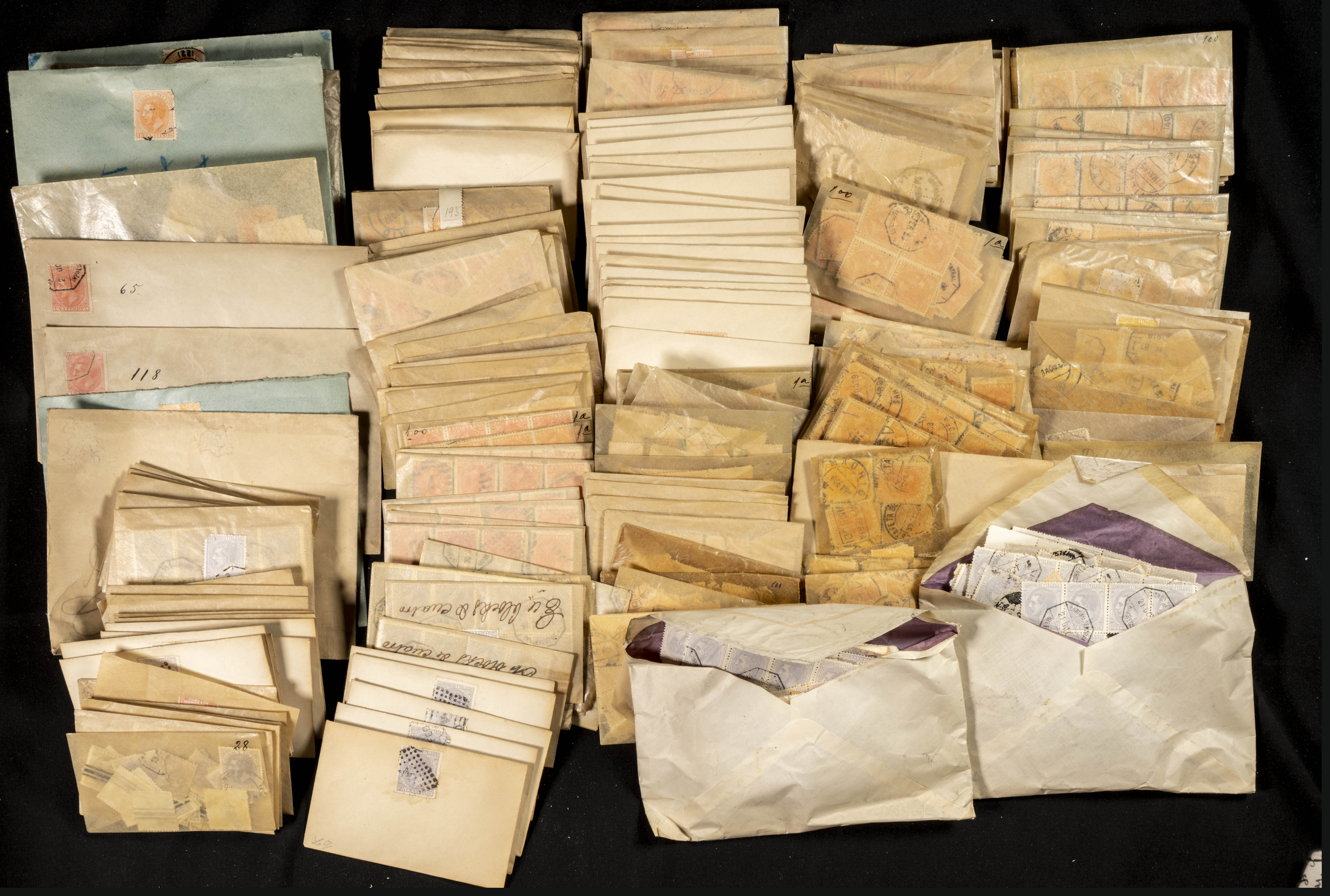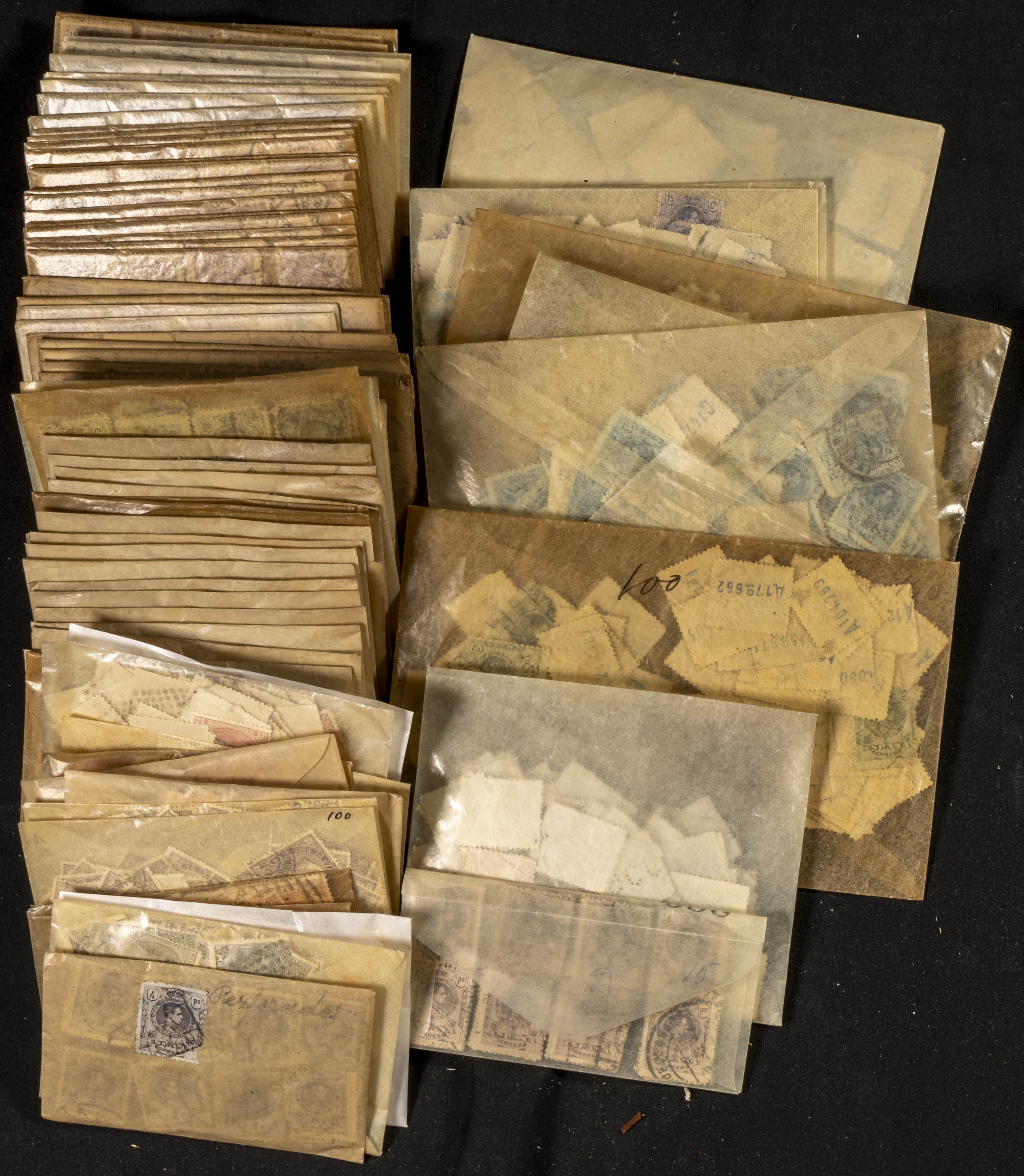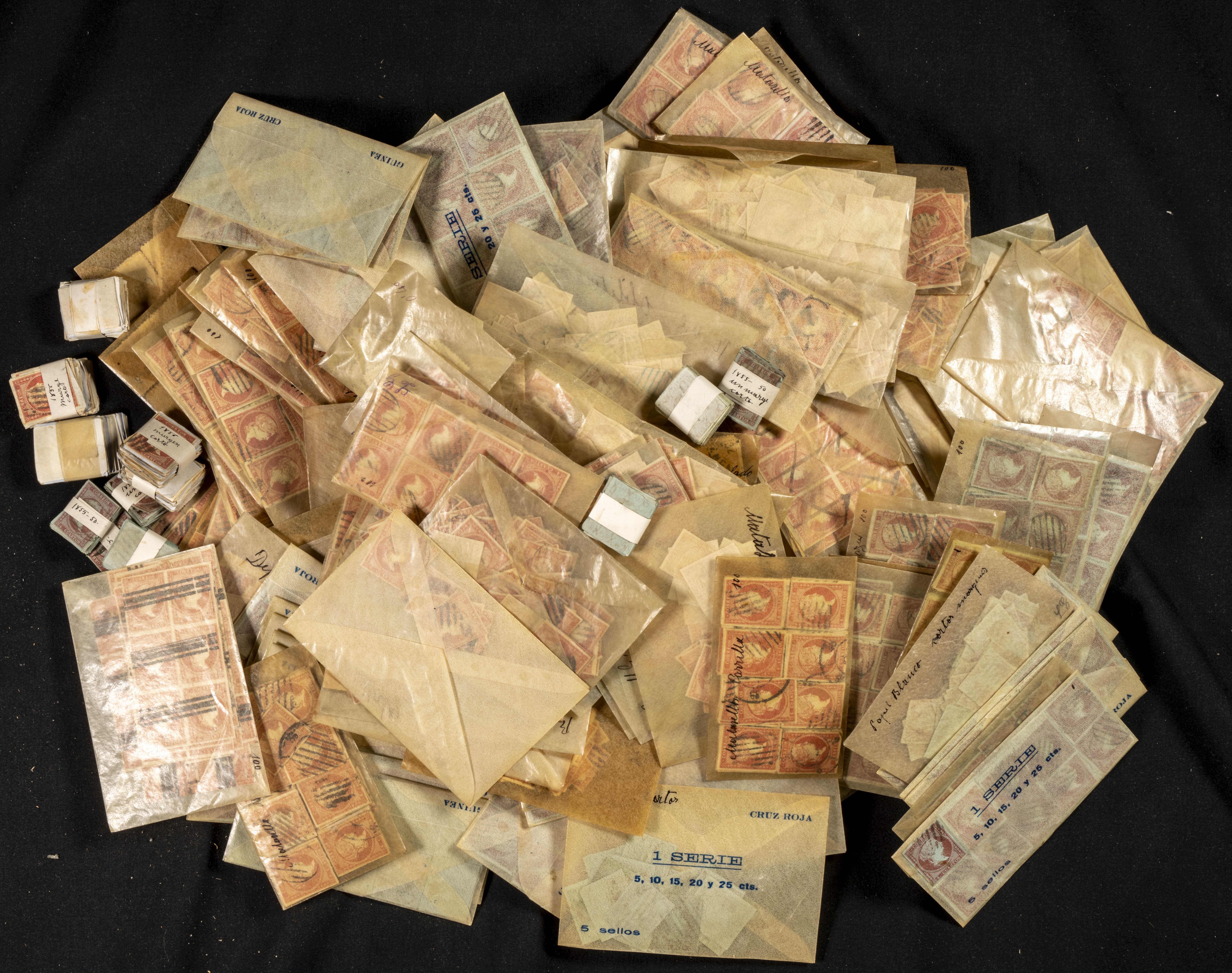 ★/(1900ca). Spectacular "virgin" and "untouched" accumulation from an old dealer from the mid-twentieth century, made up of thousands and thousands of stamps presented in "unopened tablets" or in small envelopes, very chaotic and sure to bring pleasant surprises to its future owner. Among them are the issues of Isabel II and Alfonso XII with the values of 10 pts perforated. ESSENTIAL TO EXAMINE.