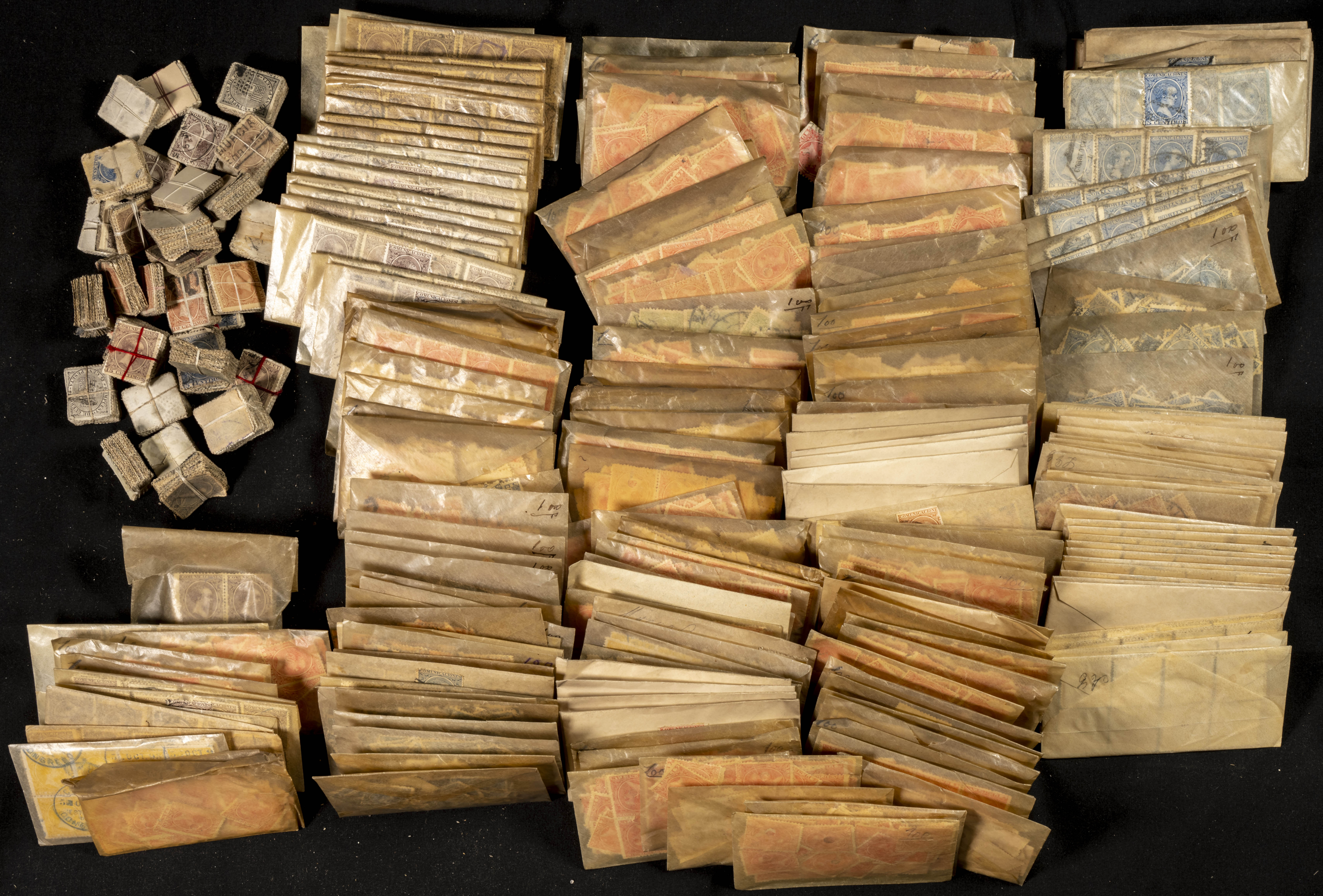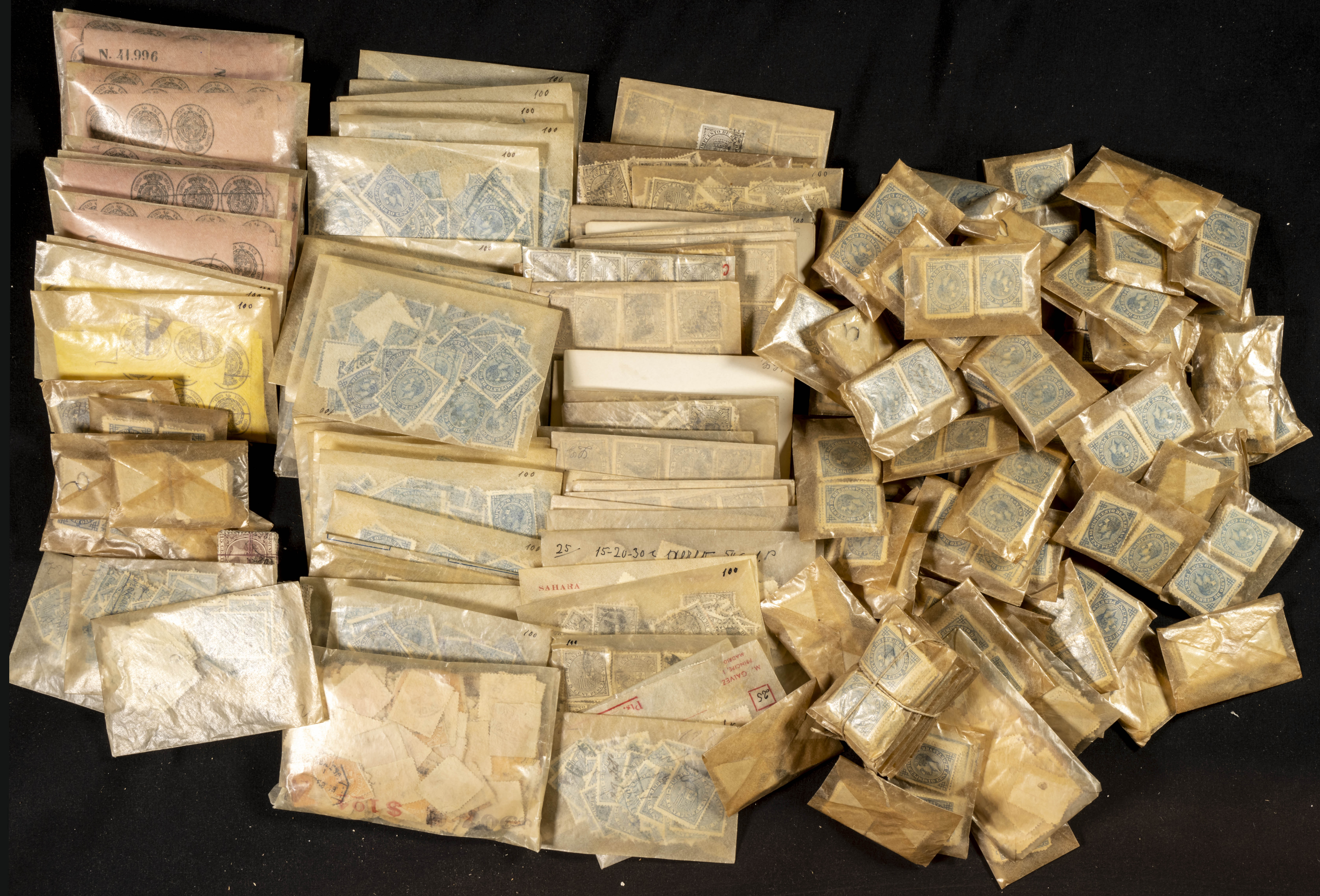 ★/(1900ca). Spectacular "virgin" and "untouched" accumulation from an old dealer from the mid-twentieth century, made up of thousands and thousands of stamps presented in "unopened tablets" or in small envelopes, very chaotic and sure to bring pleasant surprises to its future owner, especially War Tax, Official Service and Alfonso XII. ESSENTIAL TO EXAMINE.