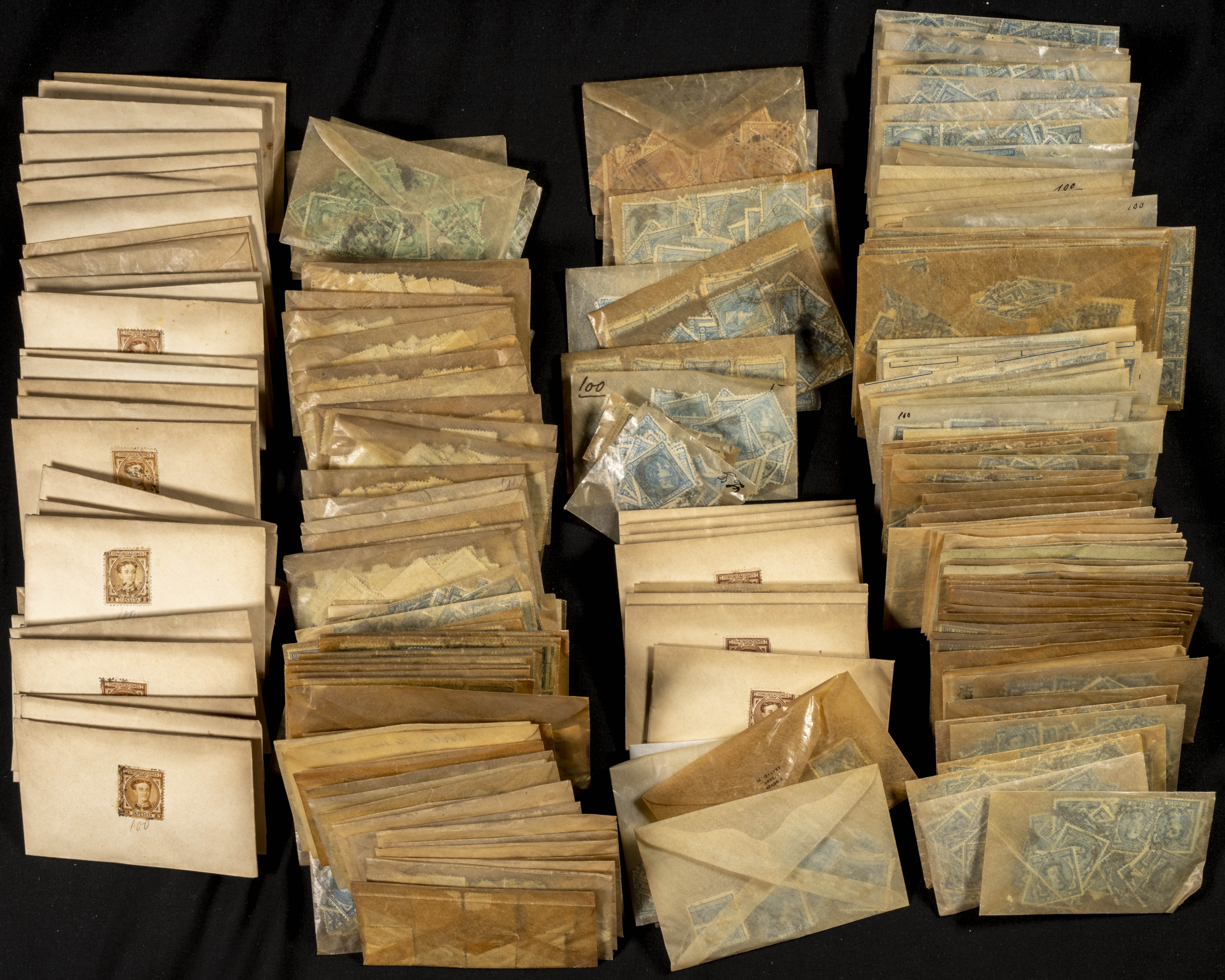 ★/(1900ca). Spectacular "virgin" and "untouched" accumulation from an old dealer from the mid-twentieth century, made up of thousands and thousands of stamps presented in "unopened tablets" or in small envelopes, very chaotic and sure to bring pleasant surprises to its future owner, highlighting 10 cts and 15 cts of Alfonso XII. ESSENTIAL TO EXAMINE.
