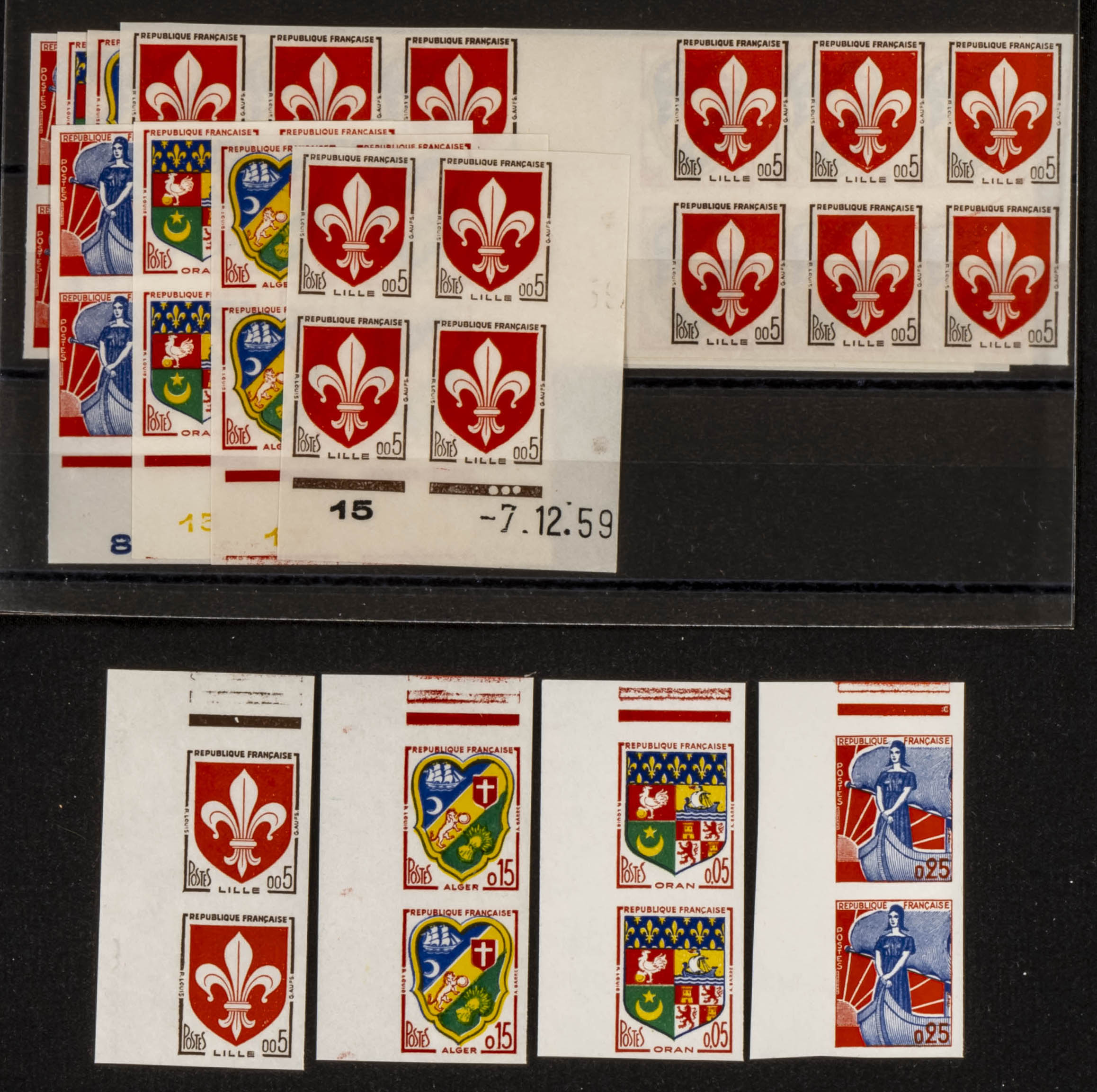 ★★Yvert 1230, 1230A, 1232, 1234(18). 1960. Set of eighteen stamps of each value of 5 cts Lille, 5 cts Oran, 15 cts Algiers and 25 cts Mariana of France and IMPERFORATED. TO BE EXAMINED.