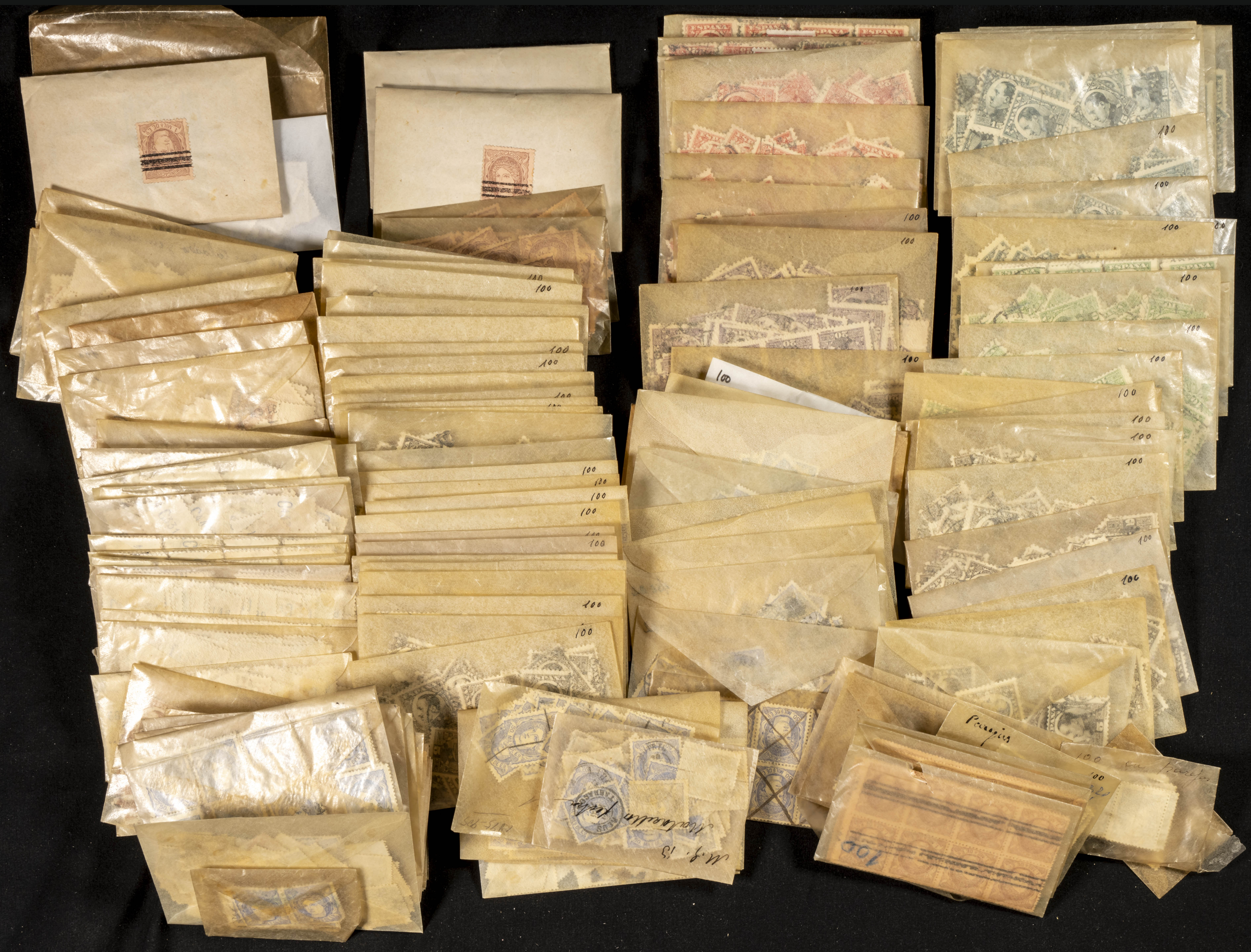 ★/(1900ca). Spectacular "virgin" and "untouched" accumulation from an old dealer from the mid-twentieth century, made up of thousands and thousands of stamps presented in "unopened tablets" or in small envelopes, very chaotic and sure to bring pleasant surprises to its future owner, Vaquer, Vaquer in profile and Matrona stand out. ESSENTIAL TO EXAMINE.