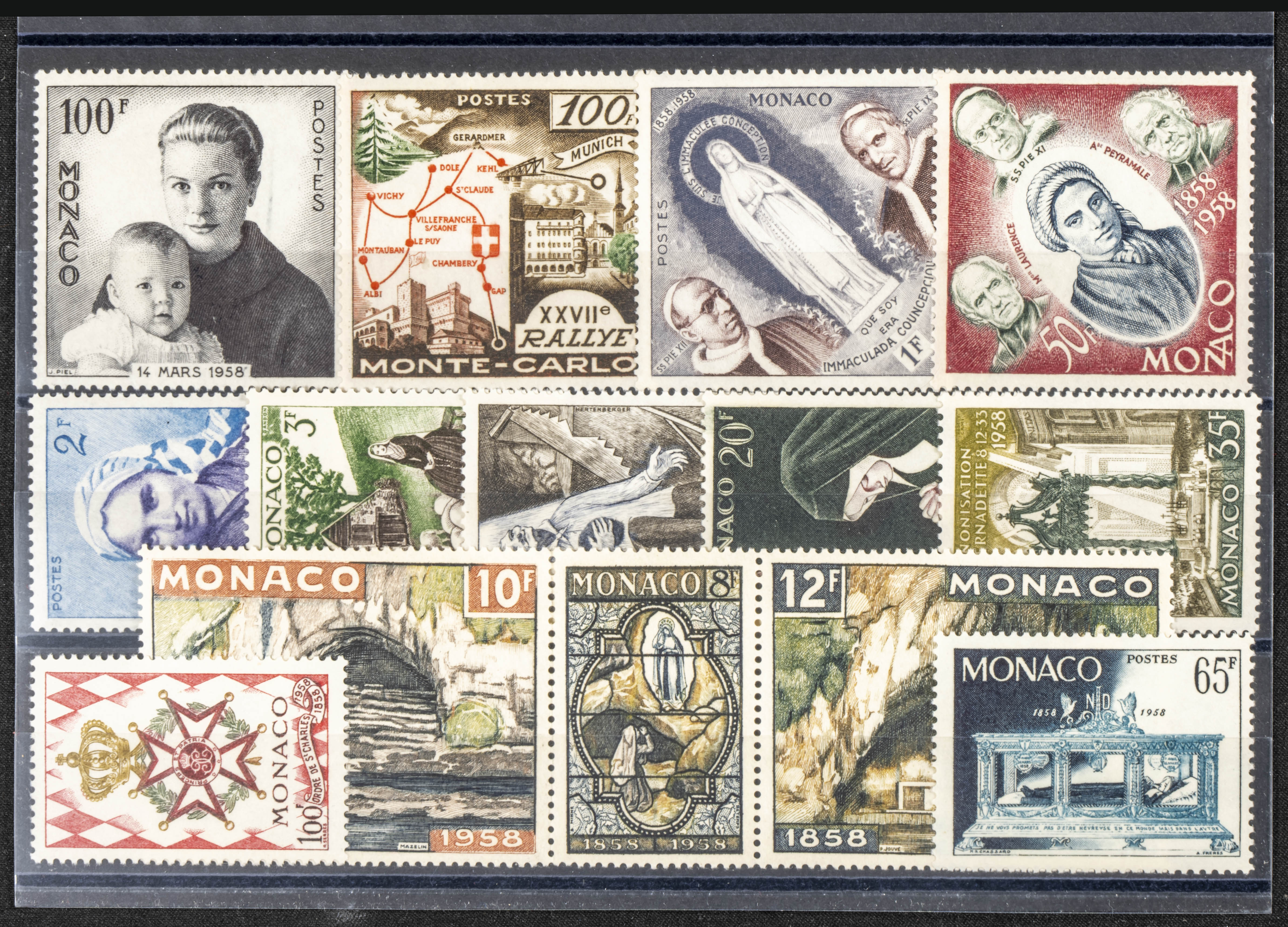 English ★★Yvert 489/02(30). 1958. Set of thirty complete years 1958 (fourteen stamps) of Monaco (mounted on tokens and covers). TO BE EXAMINED. Yvert 2023: 1,080 Euros