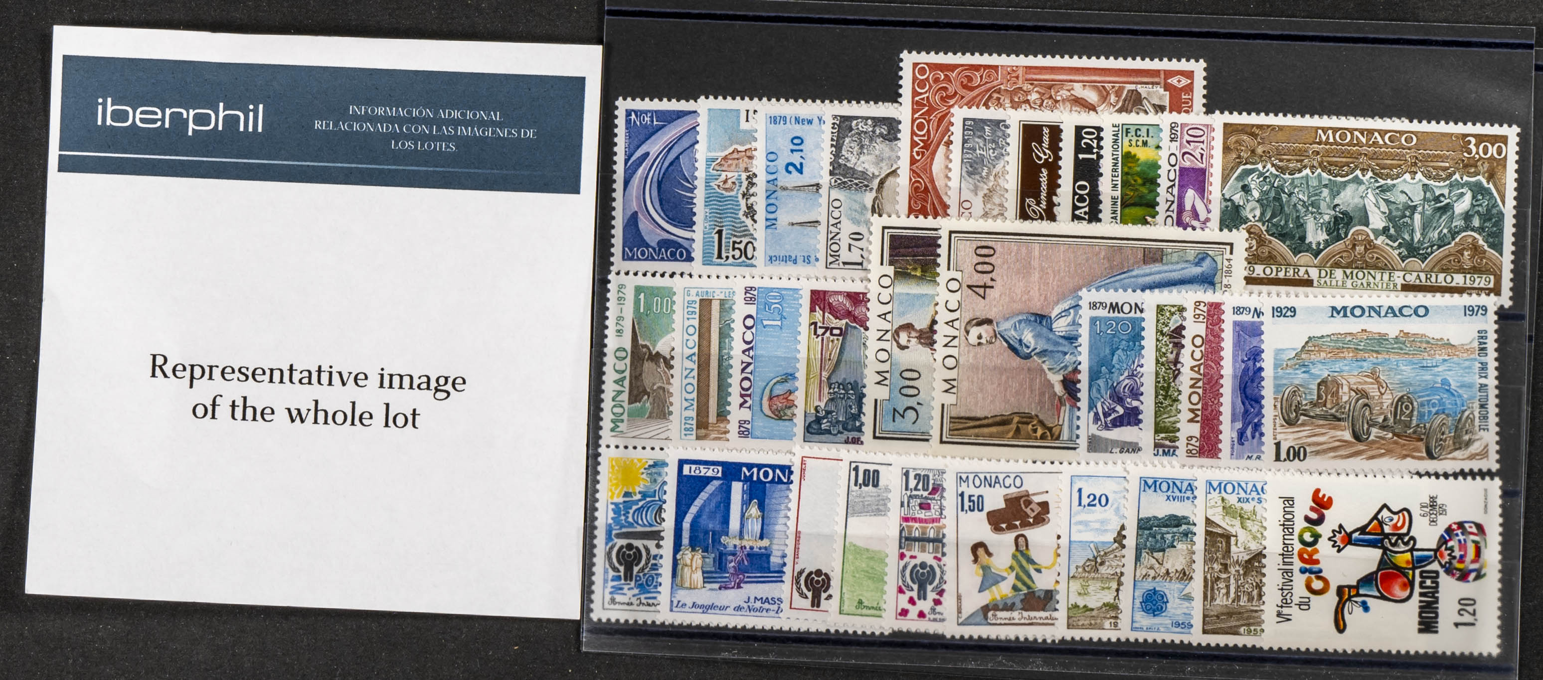 English ★★Yvert 1175/08(19). 1979. Set of nineteen complete years 1979 (regular mail only and without block sheet stamp, thirty-three stamps) from Monaco, in mint condition (mounted on chips). TO BE EXAMINED. Yvert 2023: 1,140 Euros