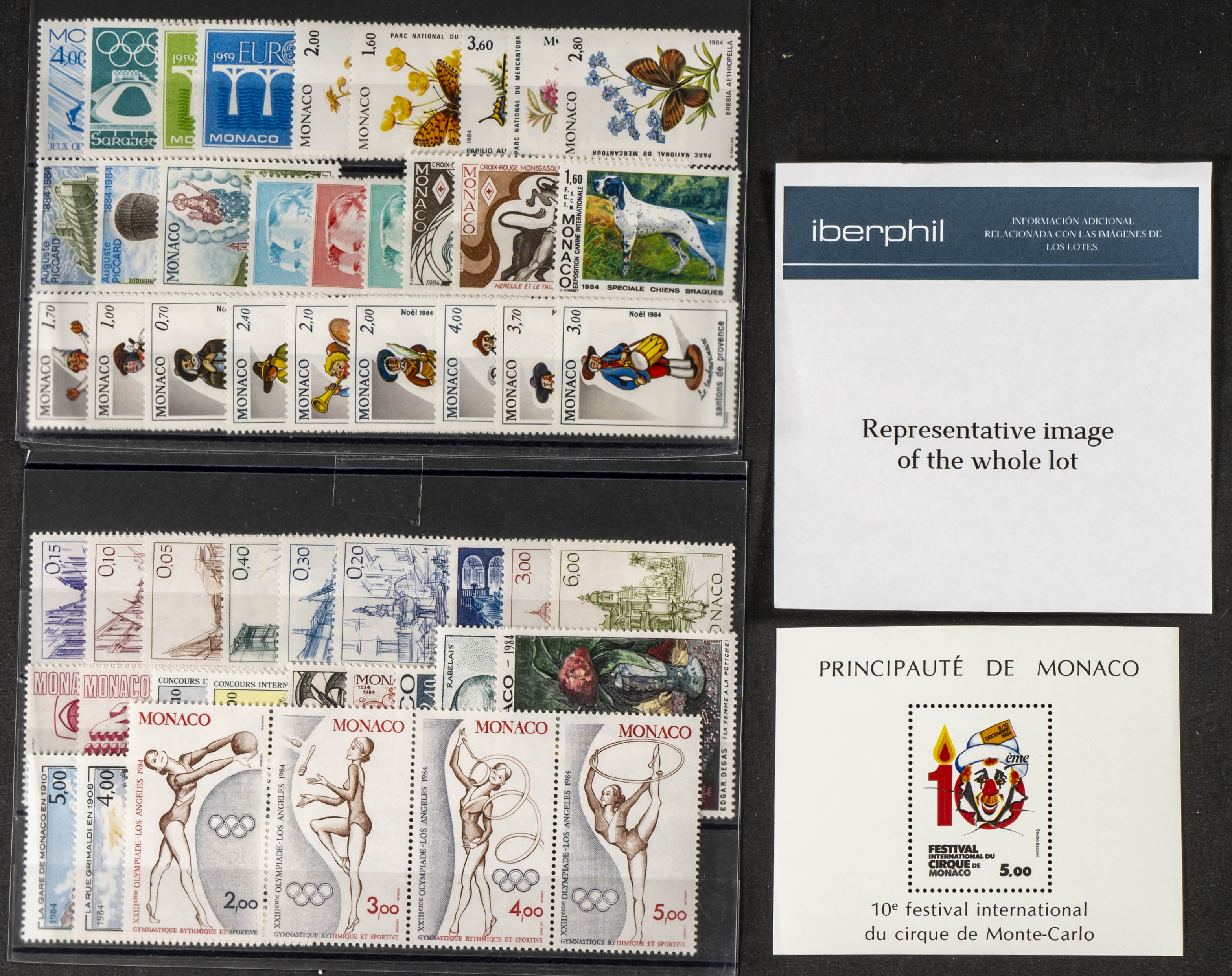 ★★Yvert 1404/55(20). 1984. Set of twenty complete years 1984 (regular mail only and including block sheet stamps) of Monaco, in mint condition (mounted on chips). TO BE EXAMINED. Yvert 2023: 2.320 Euros