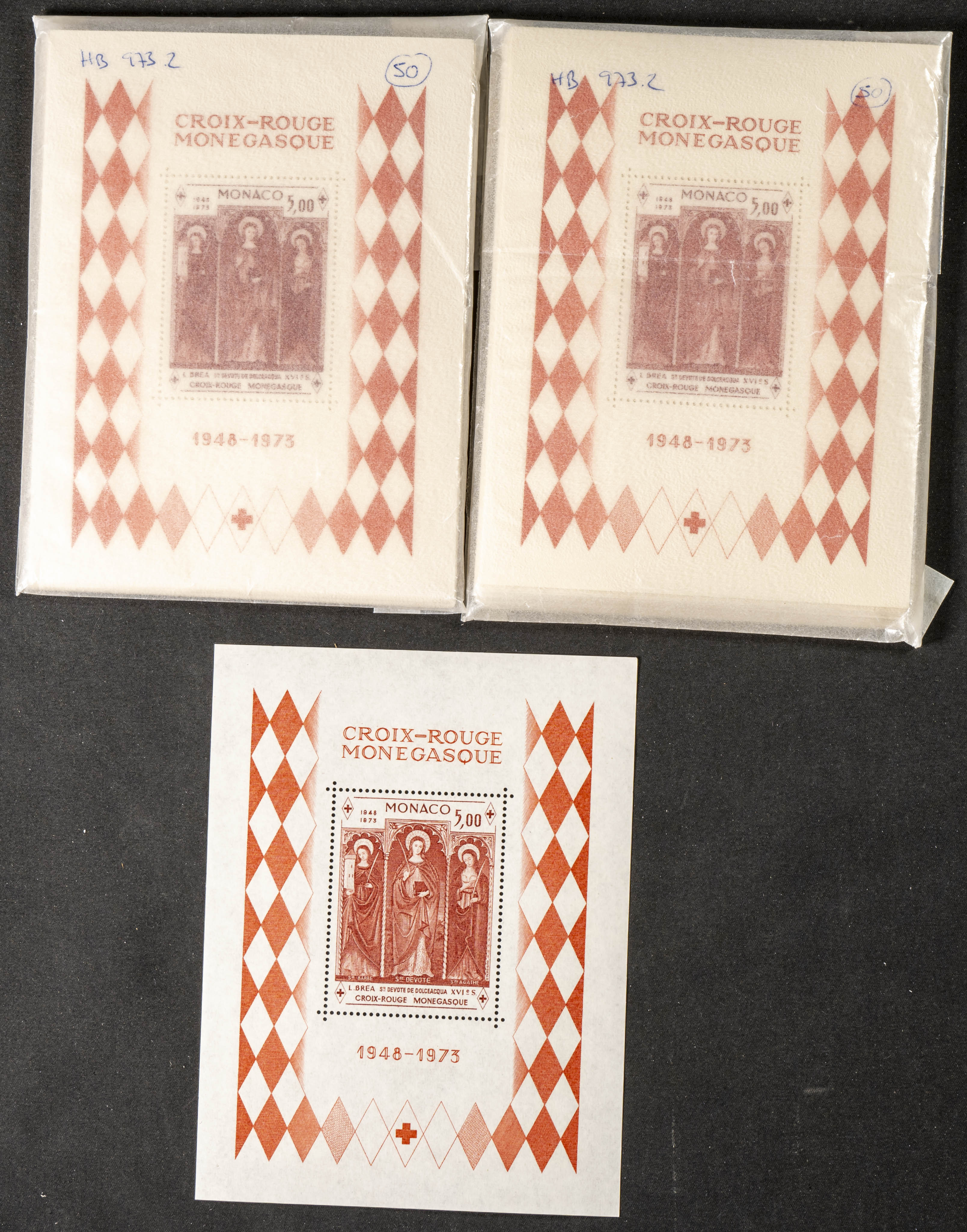 ★★Yvert HB7(100). 1973. Set of one hundred sheets of RED CROSS block from 1973 from Monaco. TO BE EXAMINED. Yvert 2023: 2,000 Euros