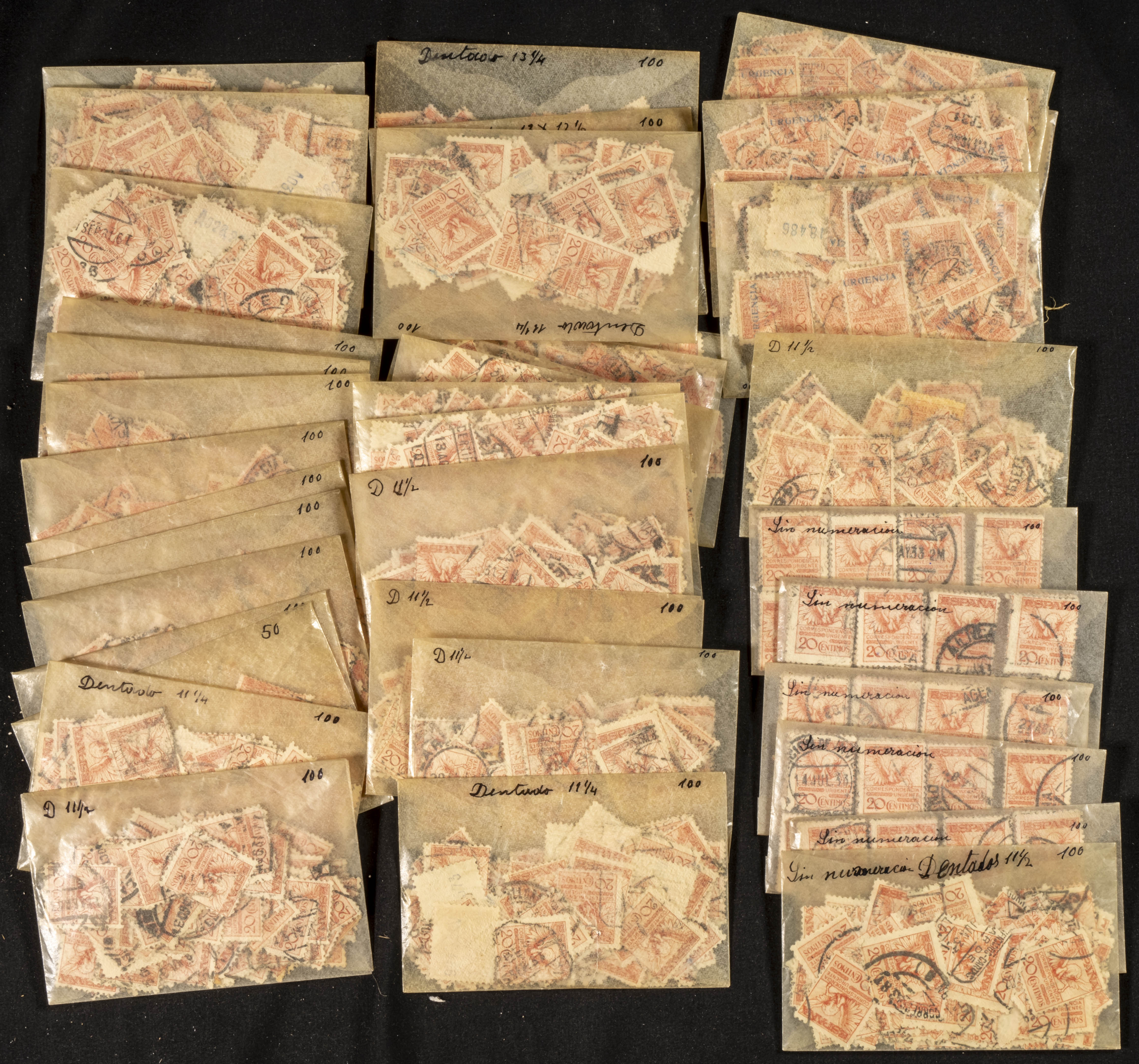 ★/(1900ca). Spectacular "virgin" and "untouched" accumulation from an old dealer from the mid-twentieth century, made up of thousands and thousands of stamps presented in "unopened tablets" or in small envelopes, very chaotic and sure to bring pleasant surprises to its future owner. Vaquer highlights from 15 cts to 1 pts, Pegasos, Pegasos Urgentes and Pegaso without number. ESSENTIAL TO EXAMINE.