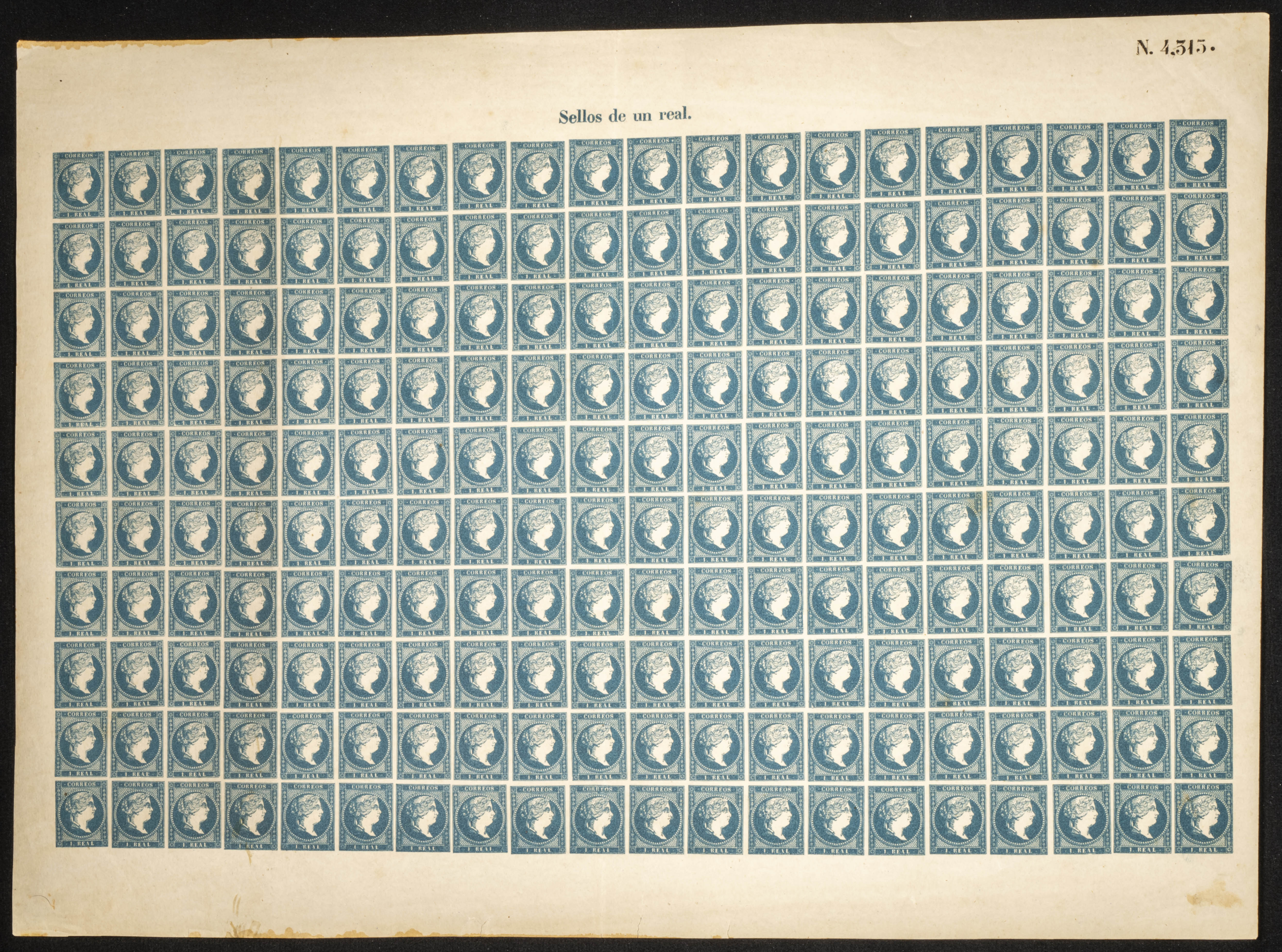 ★★ 49(200). 1855. 1 blue real, complete sheet of two hundred stamps (vertical fold affecting ten stamps, only indicated for information purposes). MAGNIFICENT AND RARE, OF ENORMOUS SPECTACULARITY. Edifil 2025: 3,600 Euros