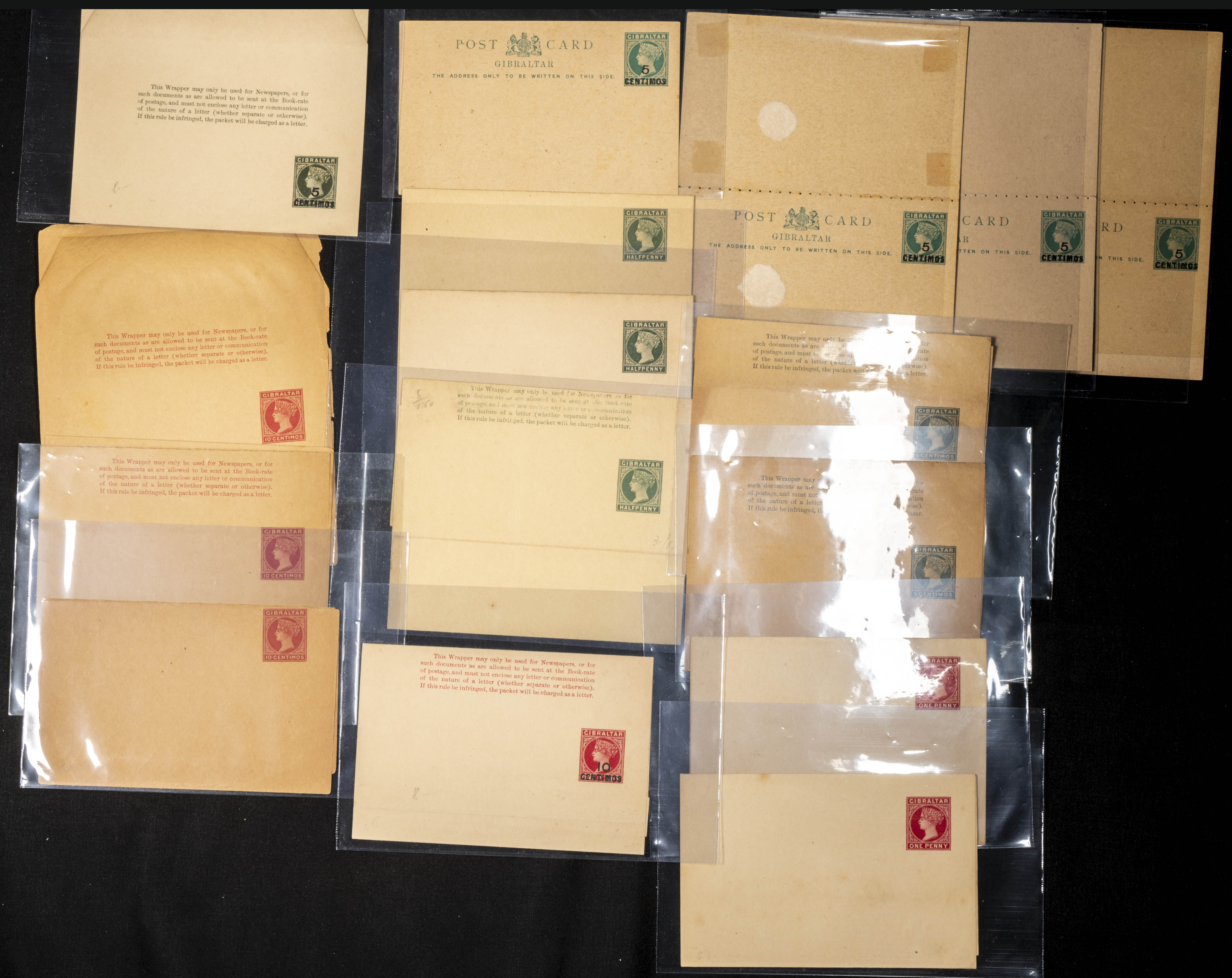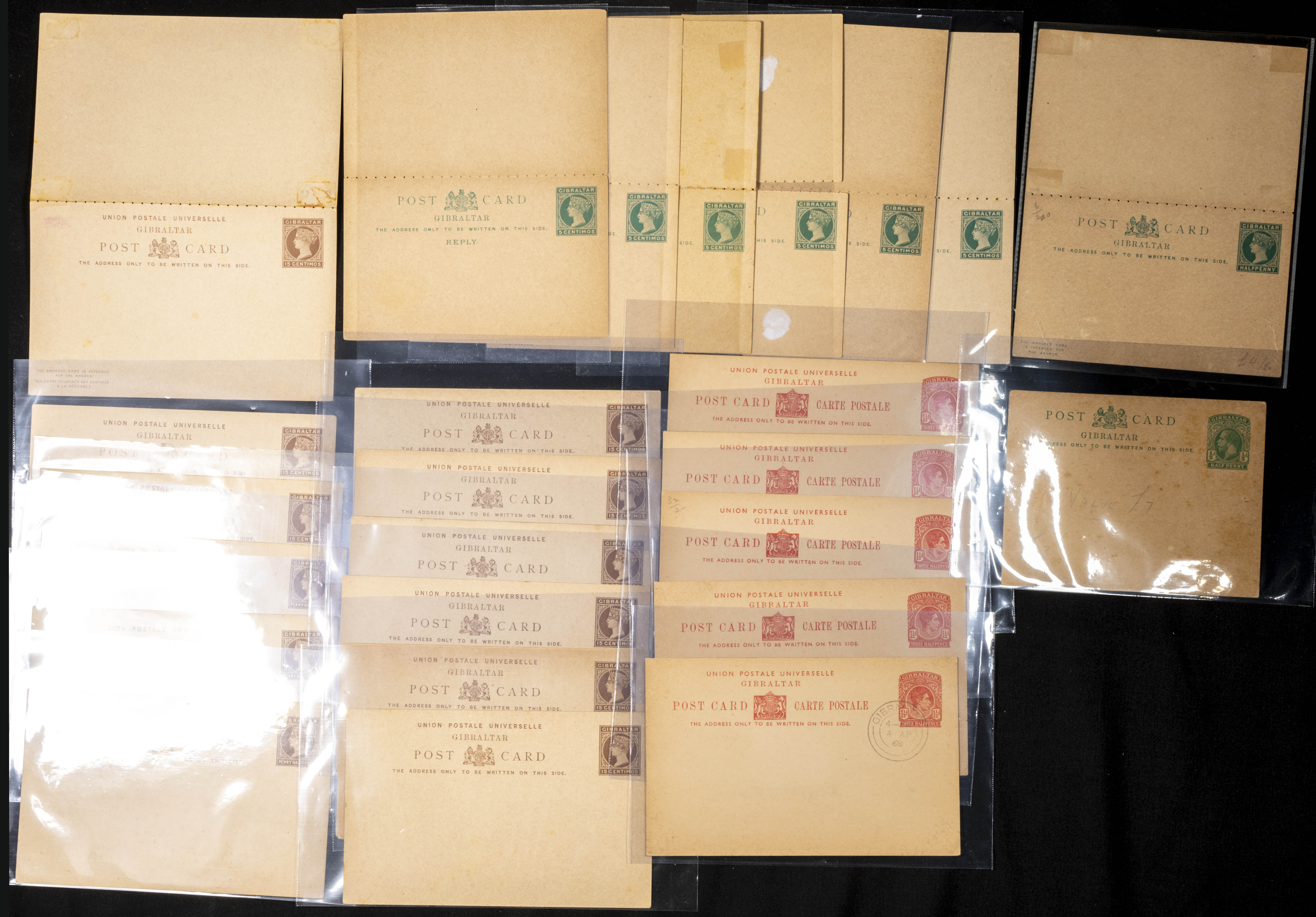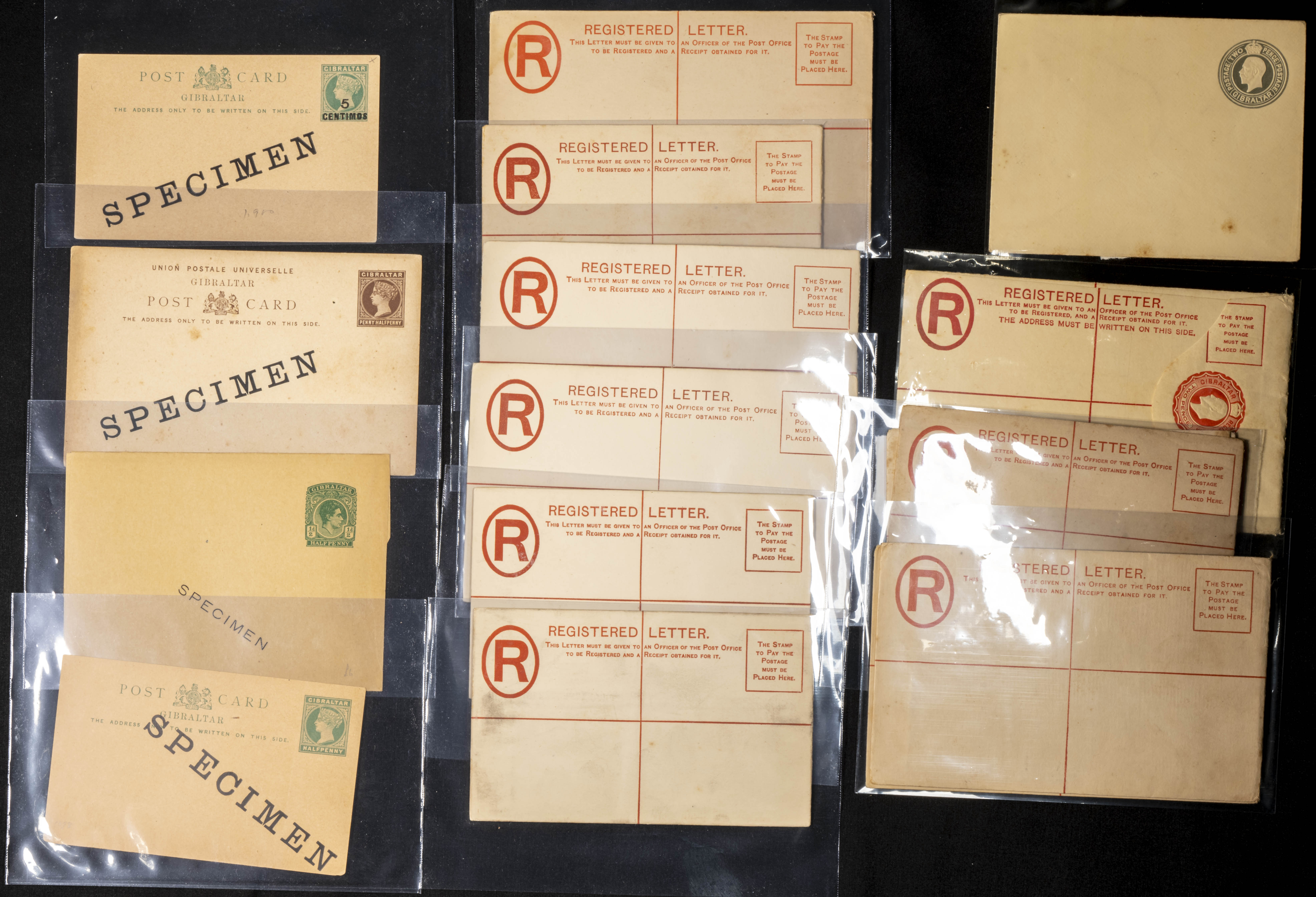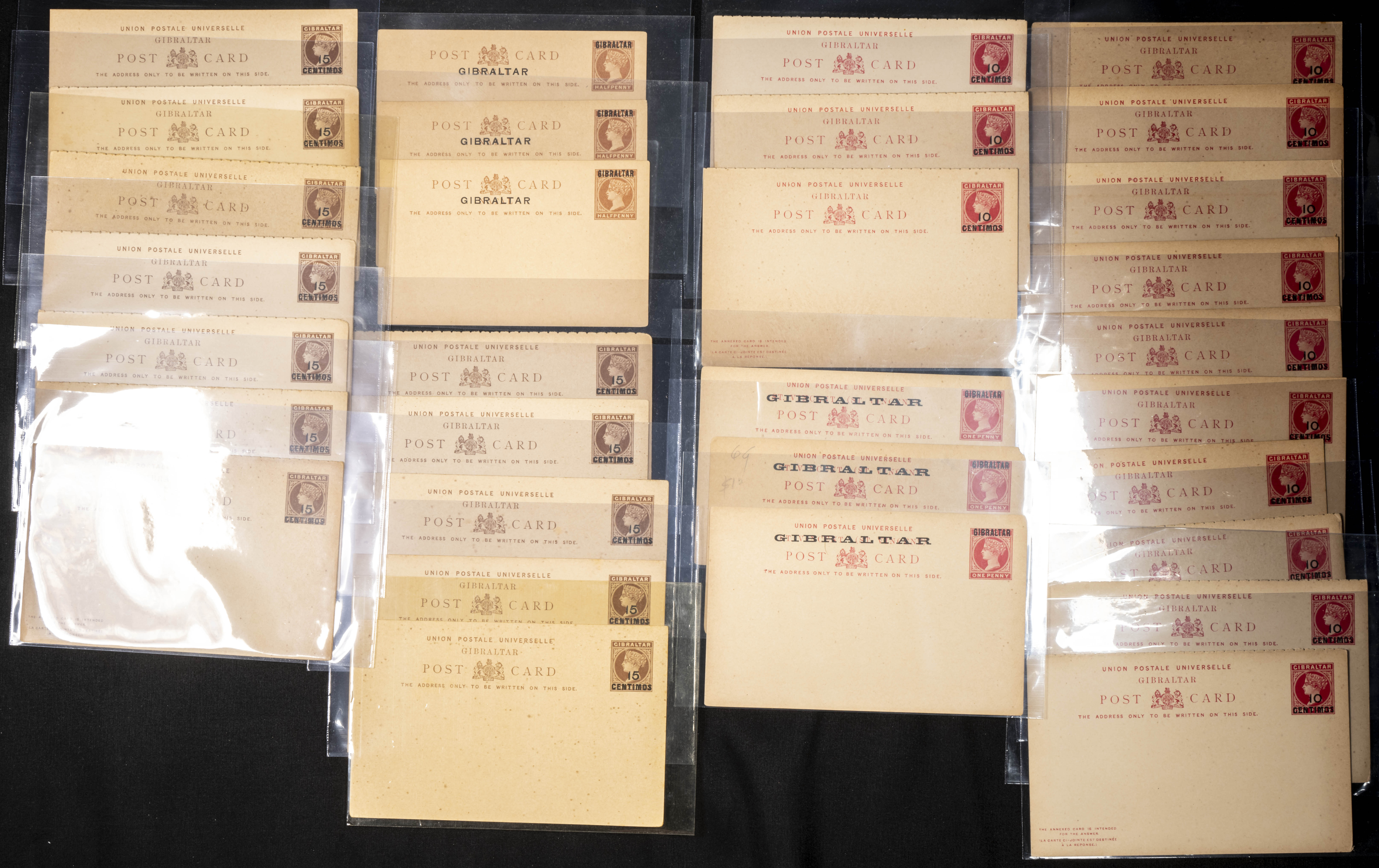 (★)(1870ca). Interesting set of more than one hundred and thirty Gibraltar Postal Cards, most of them new from the Victoria issues, including some with a SPECIMEN surcharge, several Certified Postal Envelopes, as well as some circulated ones. TO BE EXAMINED.