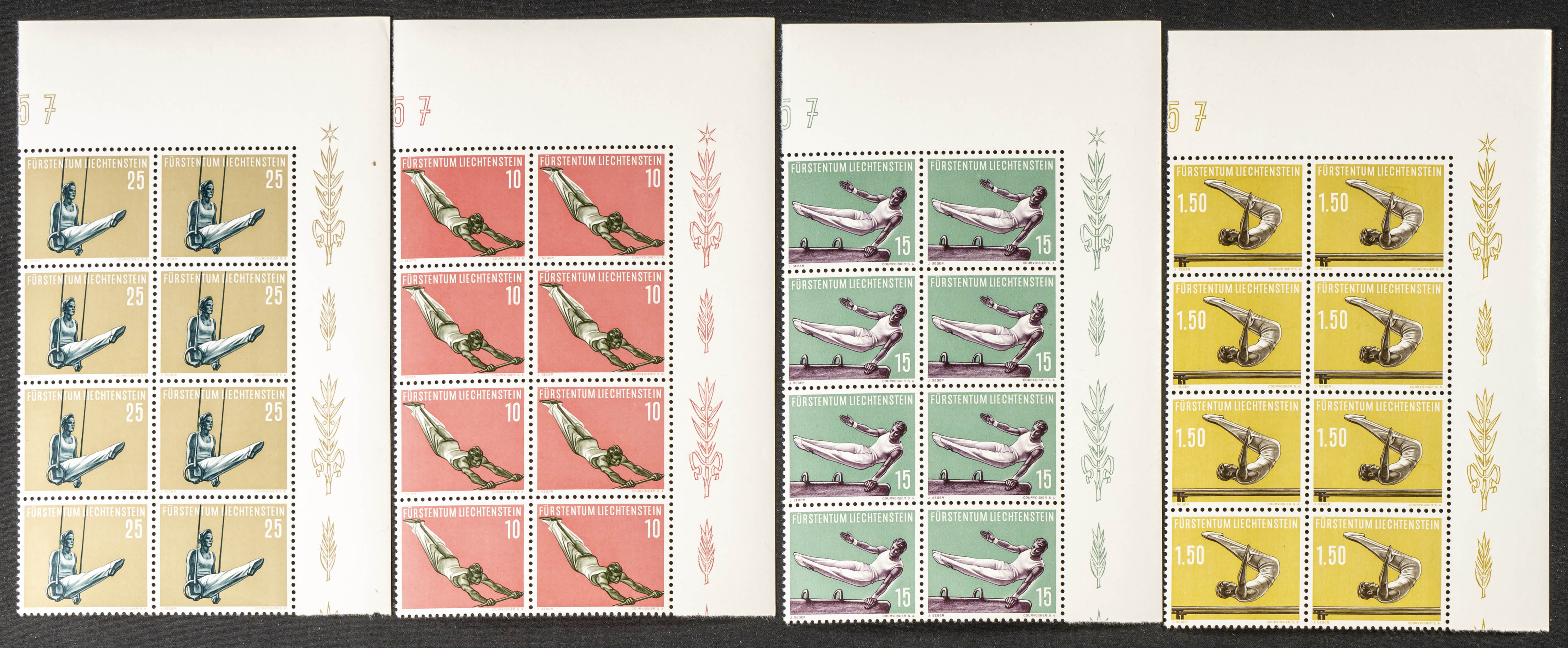 ★★Yvert 315/18(8). 1957. Eight complete series of 1957 SPORTS from Liechtenstein. MAGNIFICENT. Yvert 2019: 400 Euros