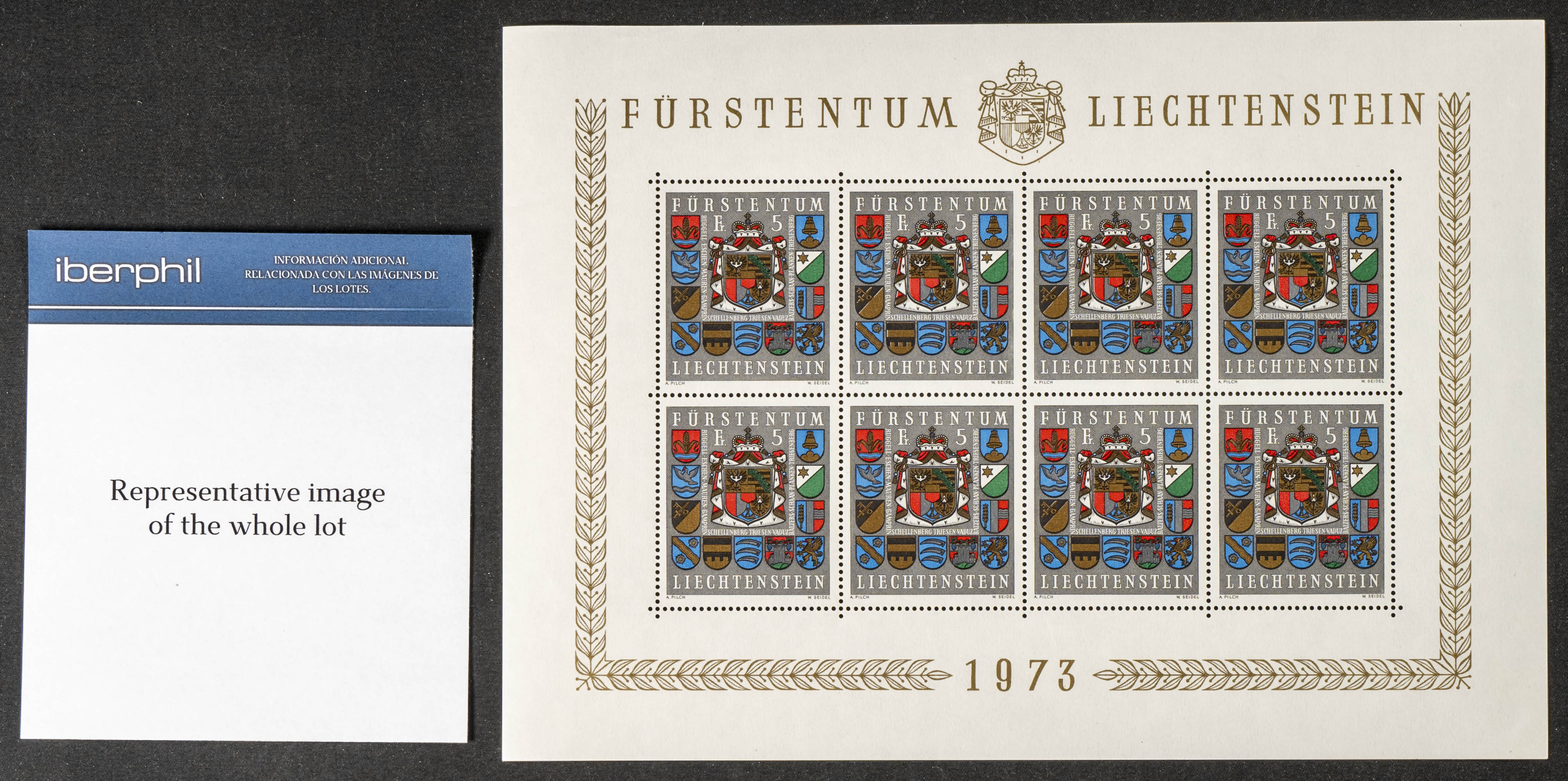 English ★★Yvert 537(200). 1973. Set of two hundred 5 f multicolor stamps (Coat of Arms) of Liechtenstein 1973, mint, in minisheets of eight stamps. TO BE EXAMINED. Yvert 2019: 1,600 Euros