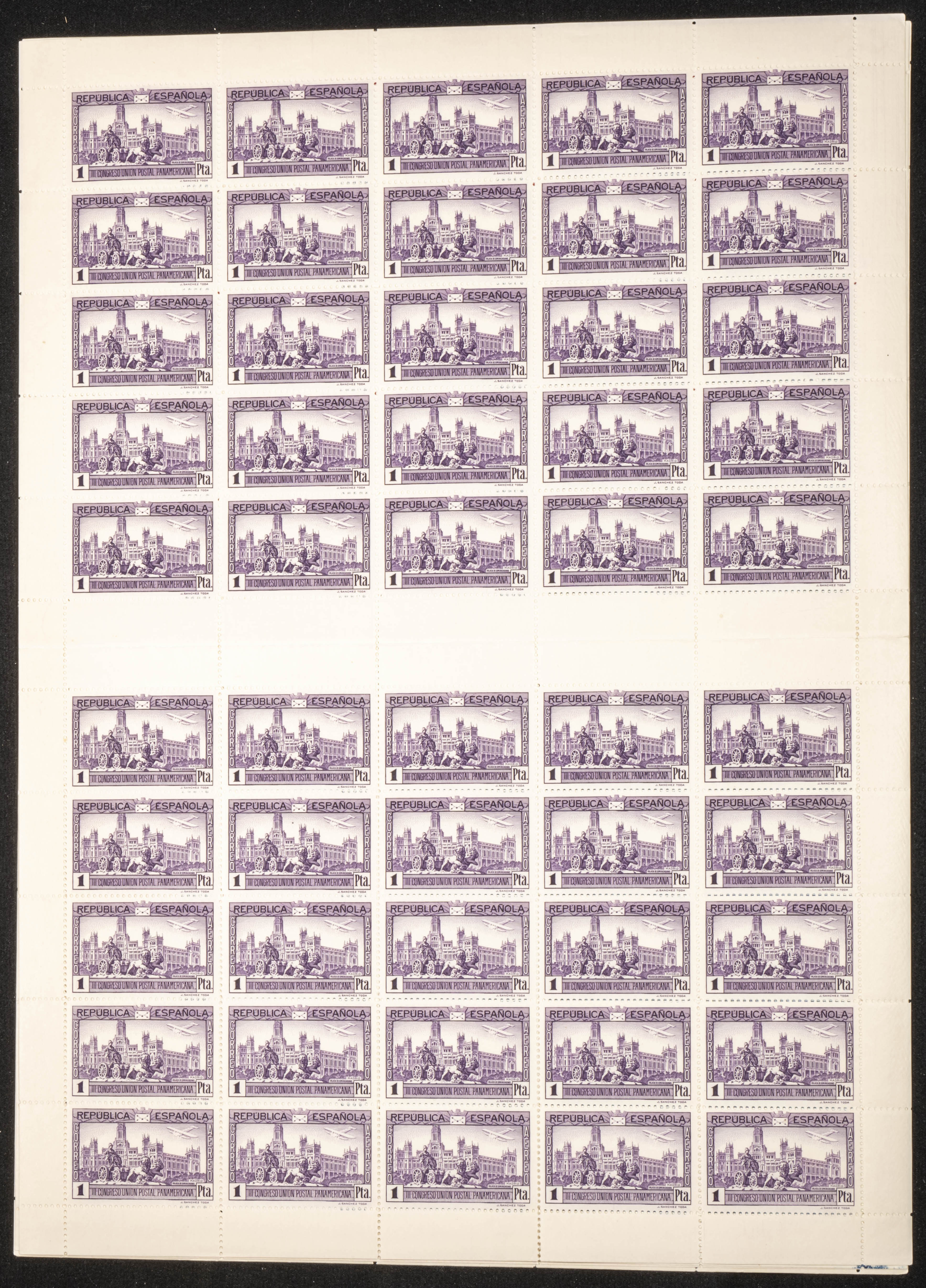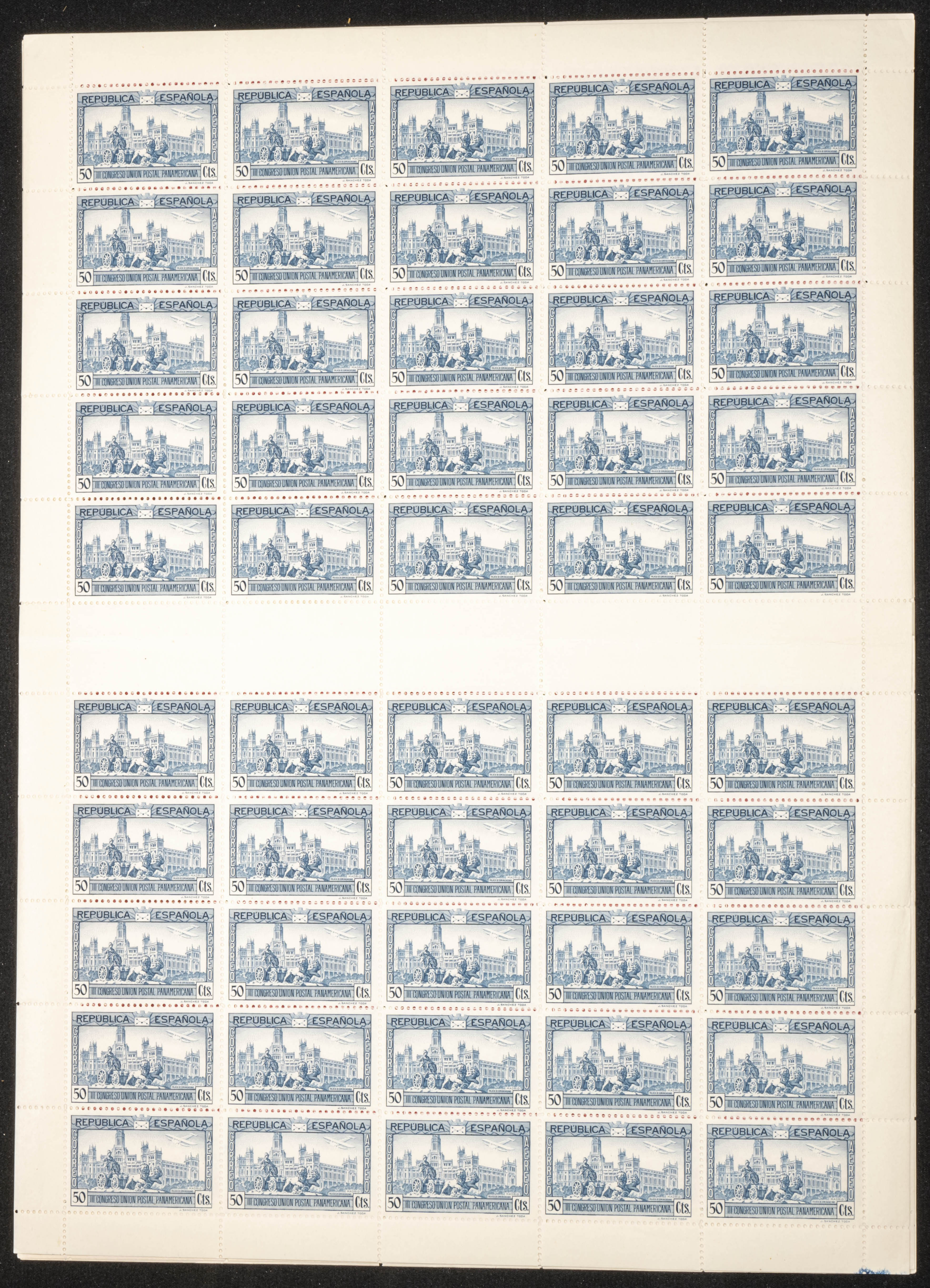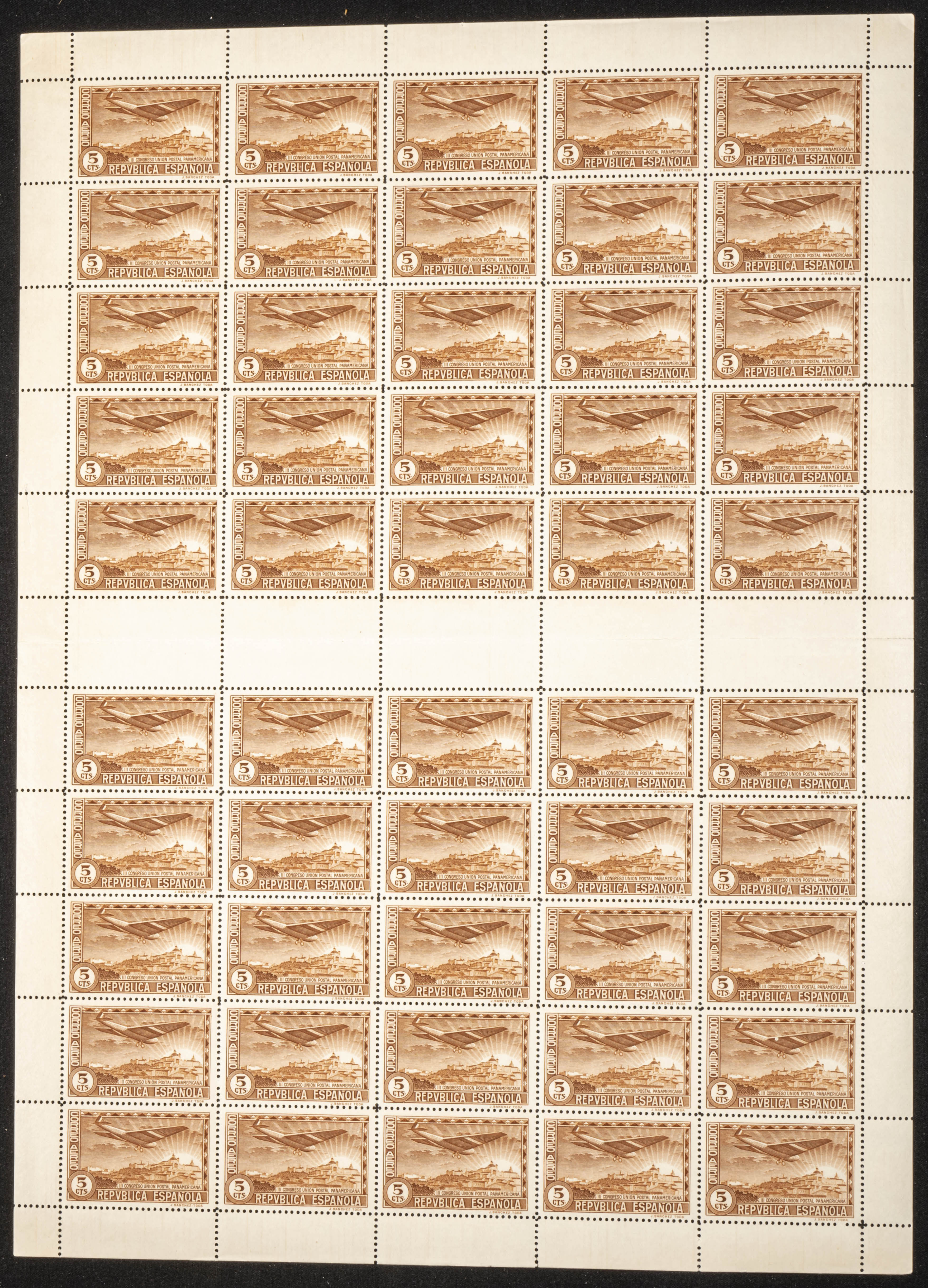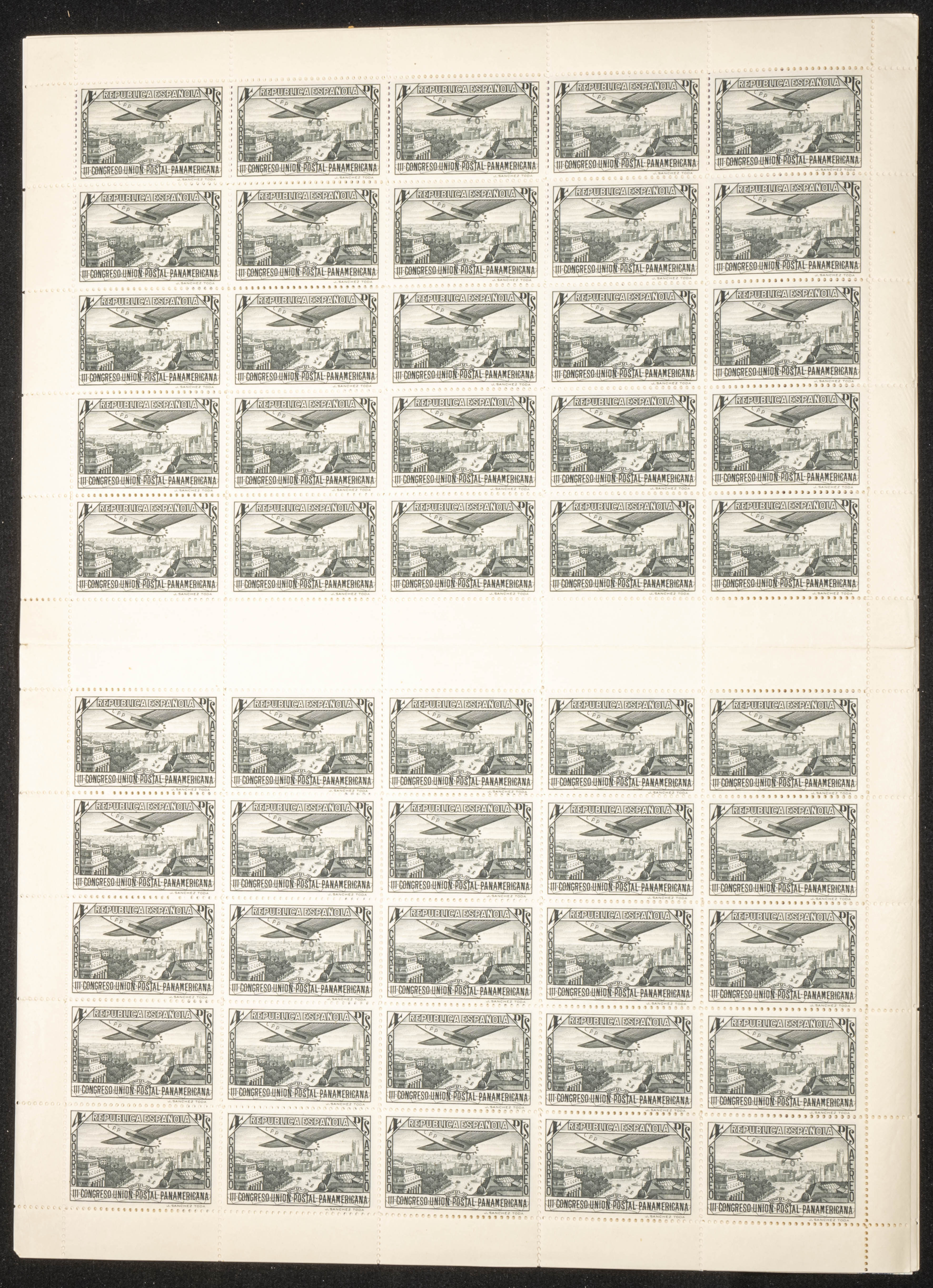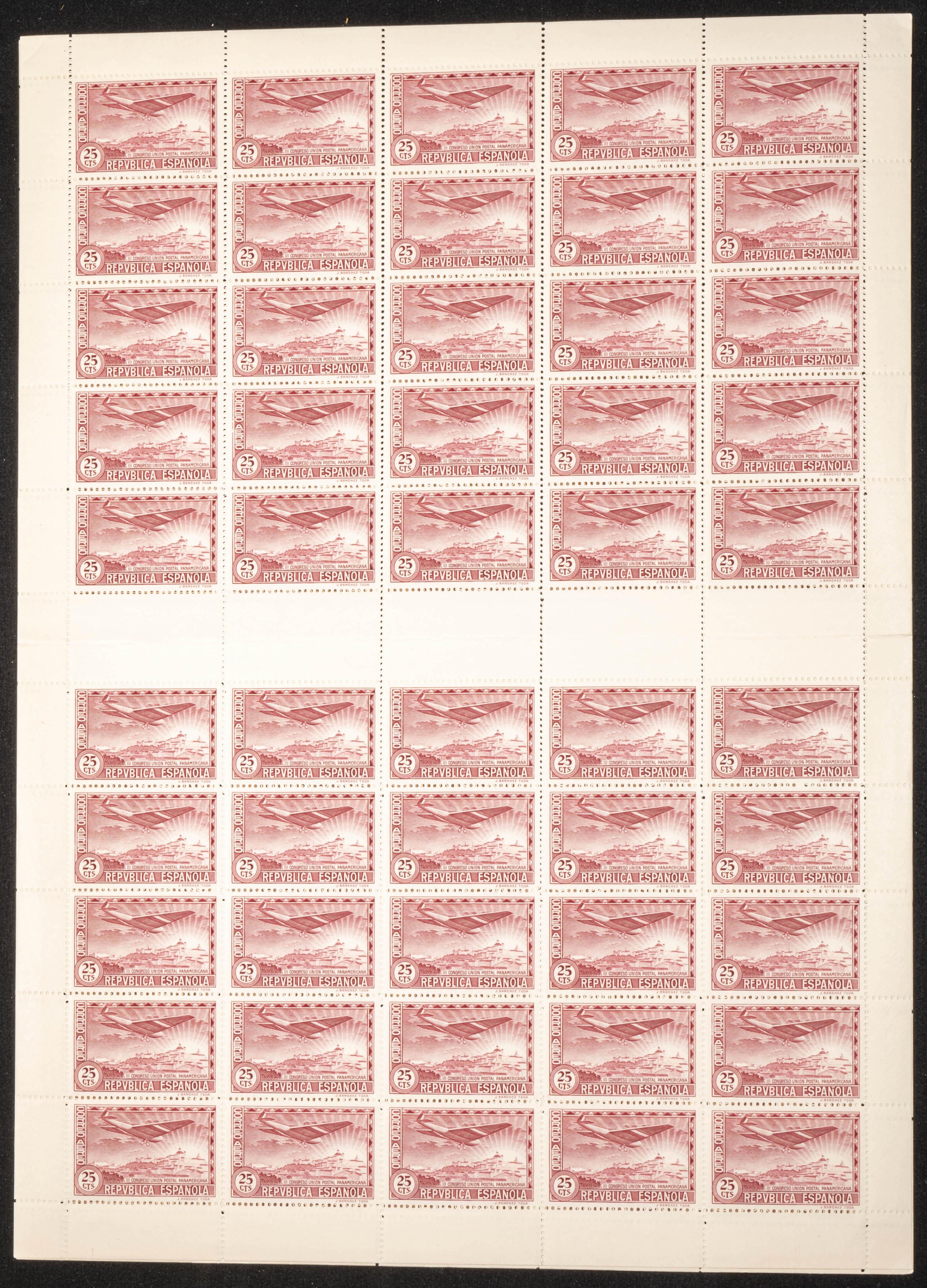 ★★ 614cc(50), 616/19cc(50). 1931. Complete PANAMERICANA AEREA series, missing the 10 cts, in sheets of fifty stamps. COLOR CHANGES. MAGNIFICENT AND RARE SET, OF ENORMOUS SPECTACULARITY THAT INCLUDES THE INTERPANEL. Edifil 2020: 6,500 Euros
