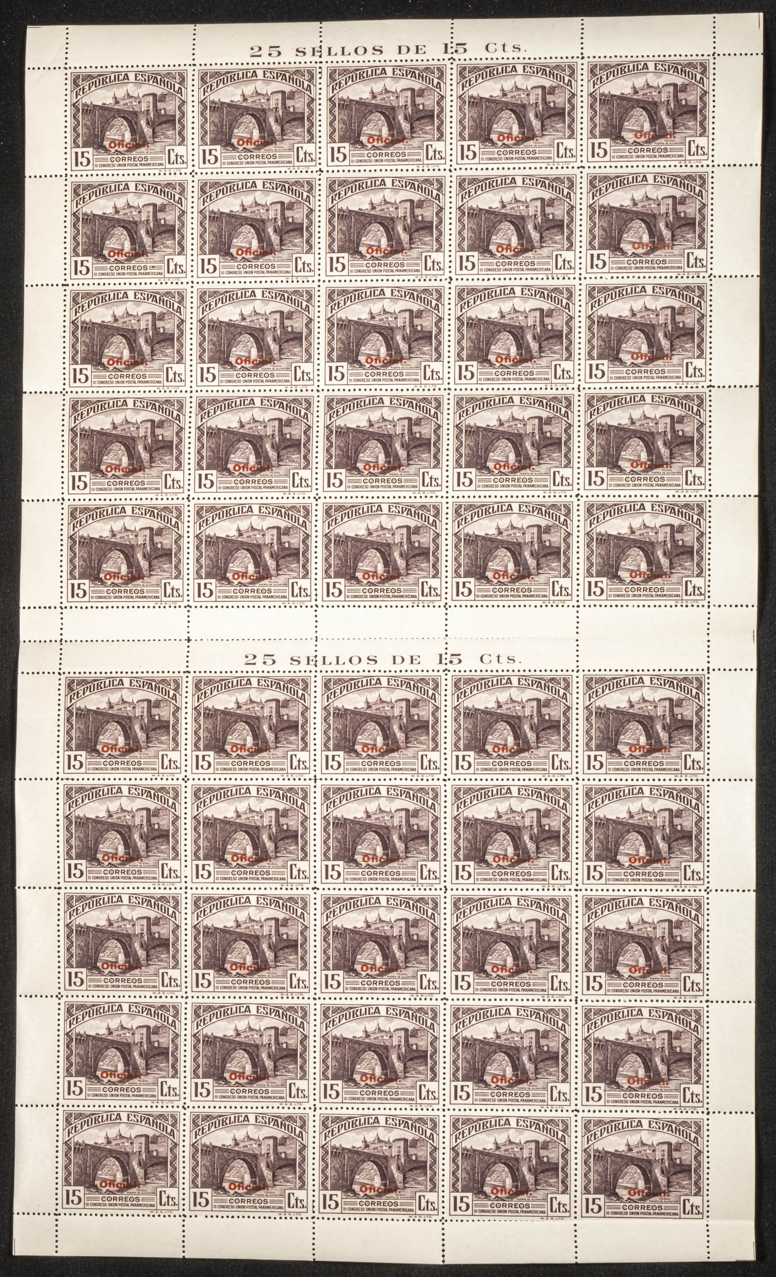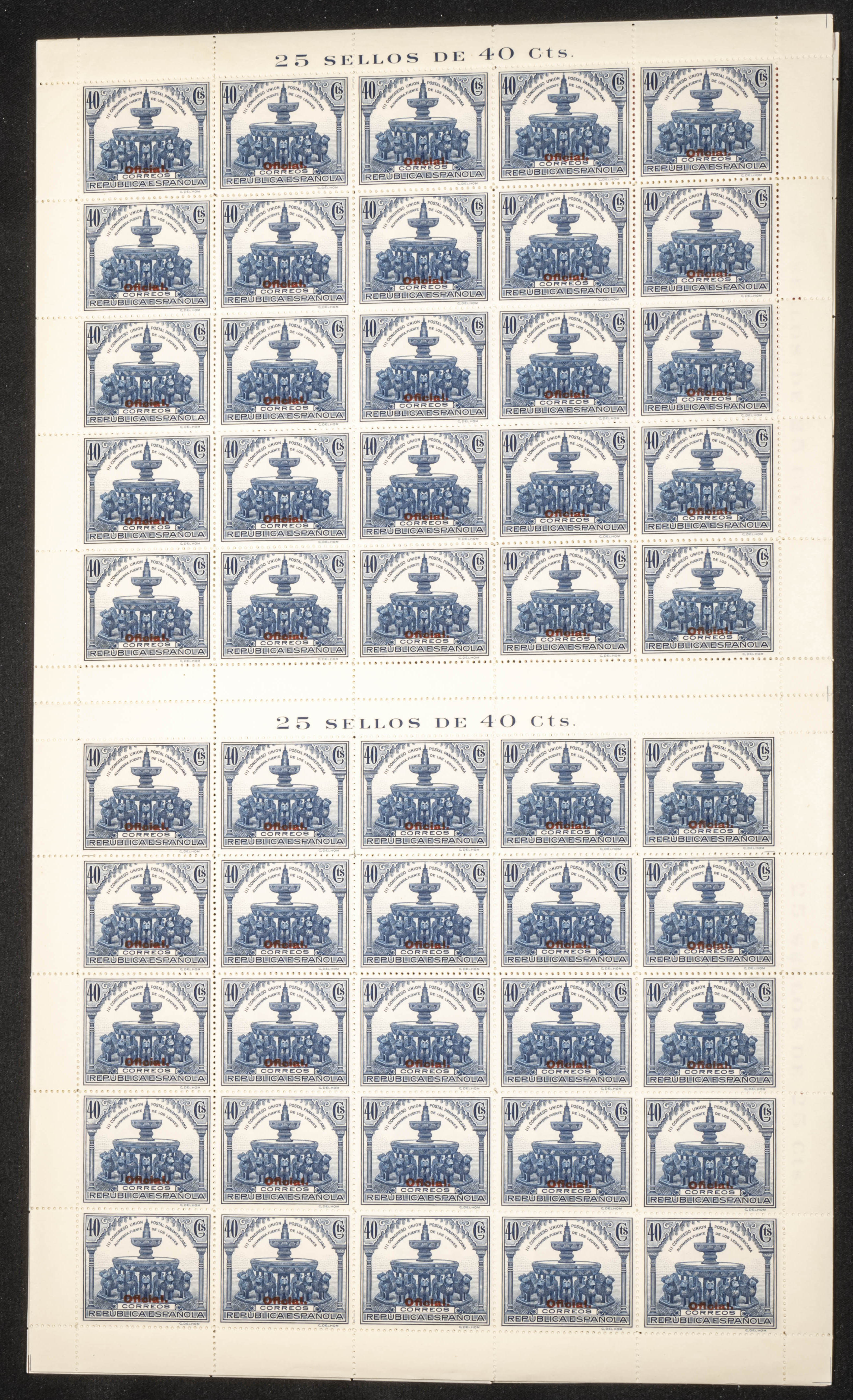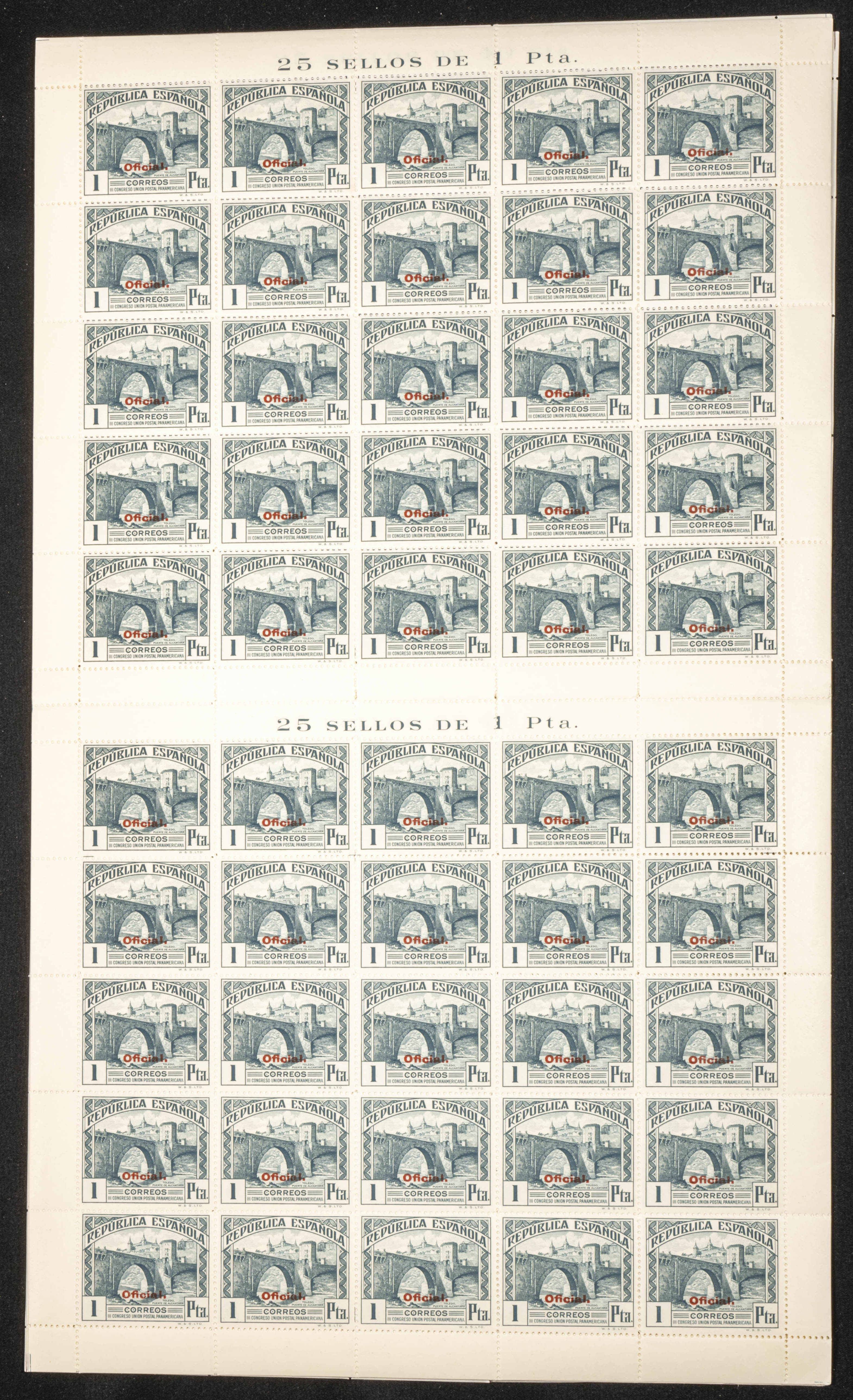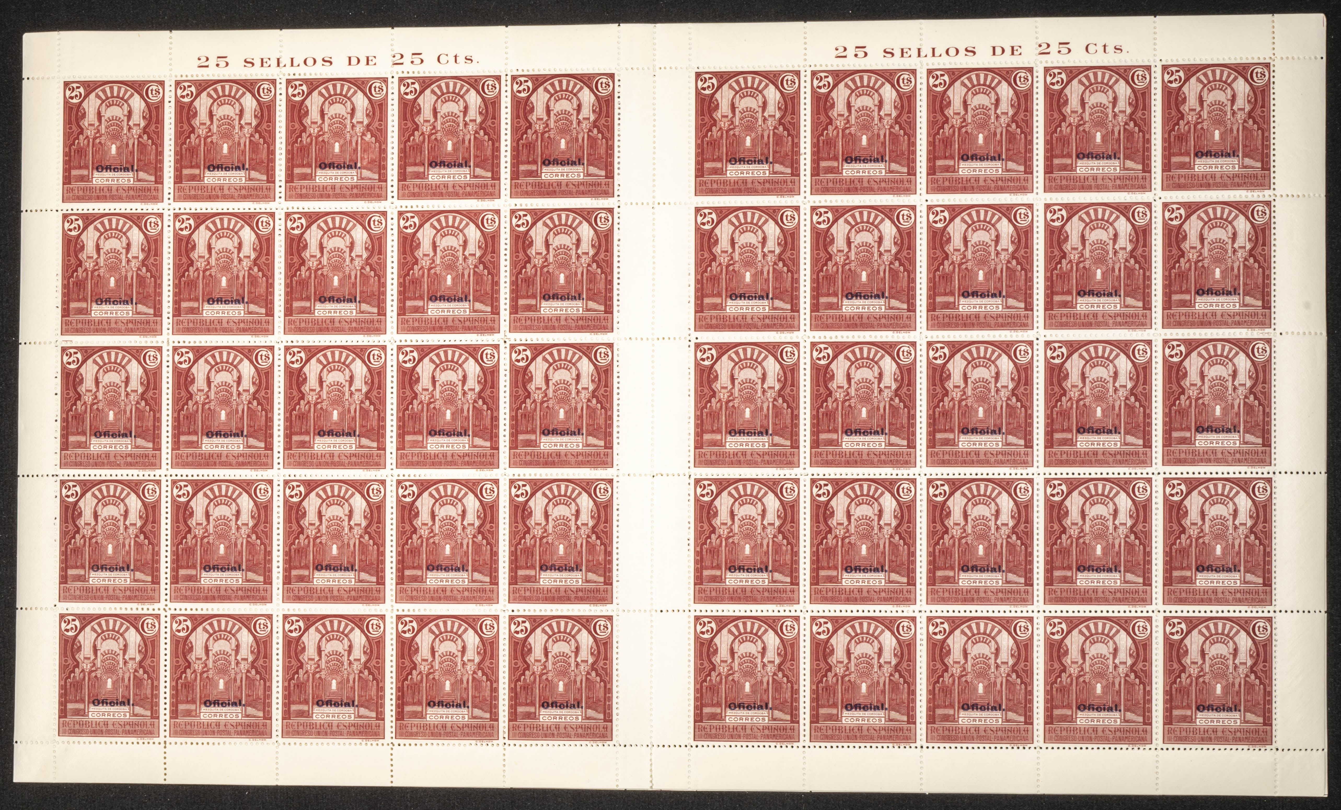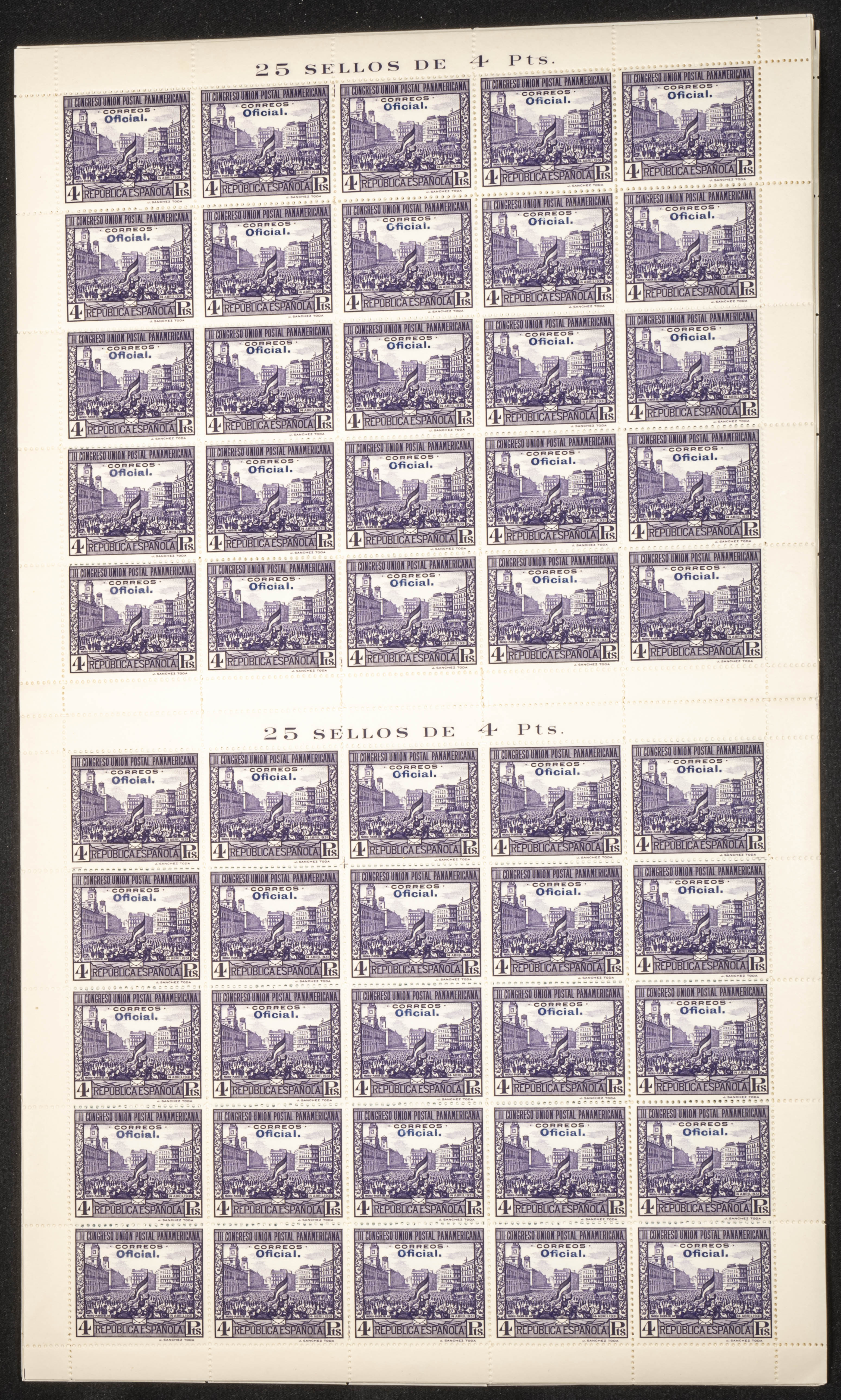 ★★ 620/29hcc(50). 1931. Complete PANAMERICAN OFFICIAL set, five values, in sheets of fifty stamps. COLOR CHANGES OF THE OVERPRINT. MAGNIFICENT AND RARE SET, OF ENORMOUS SPECTACULARITY THAT INCLUDES THE INTERPANEL. Edifil 2020: 9,350 Euros