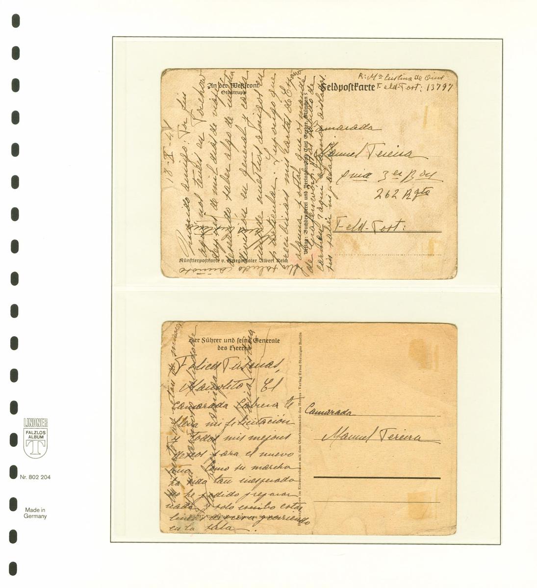 1941. Interesantísimo conjunto de once tarjetas postales remitidas desde los hospitales de Porchov (Feldpost Nº13797), Vilna (Feldpost Nº46630) y por último desde Konigsberg, entre Octubre de 1941 y Julio de 1942, escritas por la enfermera Mª Cristina de Orive Alonso durante su periplo por los diferentes hospitales asignados para la División Azul, todas excepto una que tiene marca alemana del Feldpost Nº40788 (circularon en el interior de sobres, por lo que carecen de marcas postales o de la División Azul). MAGNIFICO Y RARISIMO CONJUNTO.
