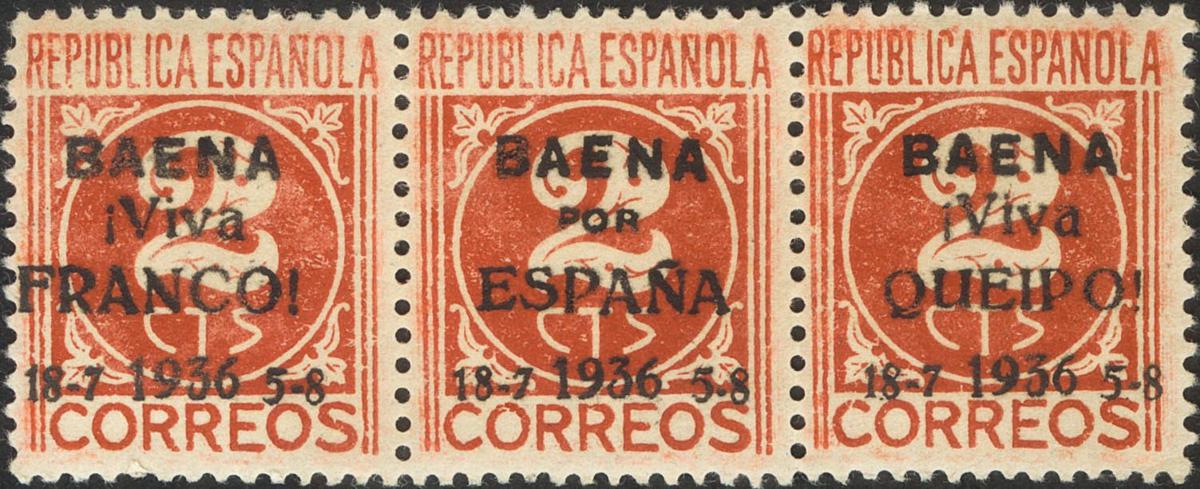 ★★ 17hcc. 1937. 2 cts castaño, tira de tres. CAMBIO DE COLOR EN LA SOBRECARGA, en negro. MAGNIFICA. Edifil 2017: 29 Euros