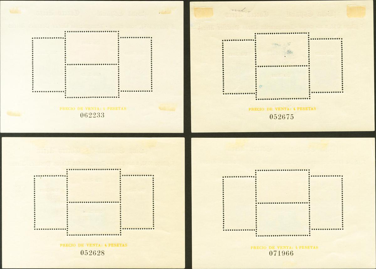 ★★/★ 95/97, 95A. 1938. Conjunto de las cuatro hojas bloque (conservación habitual) con las sobrecargas en negro, azul, rojo y la Tipo II. MAGNIFICO. Edifil 2017: 246 Euros