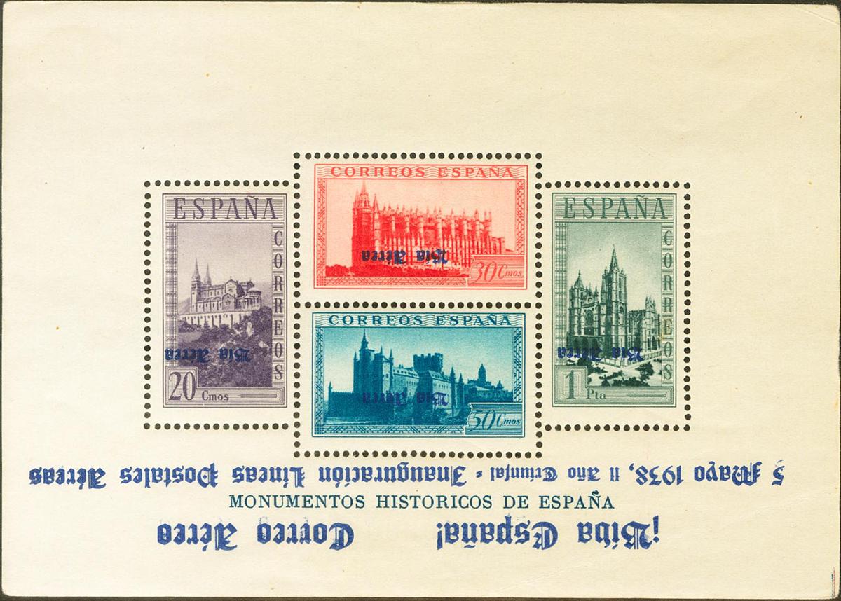 ★ 95hi. 1938. Hoja bloque (conservación habitual). SOBRECARGA INVERTIDA, en azul. MAGNIFICA Y RARISIMA. Edifil 2017: +185 Euros