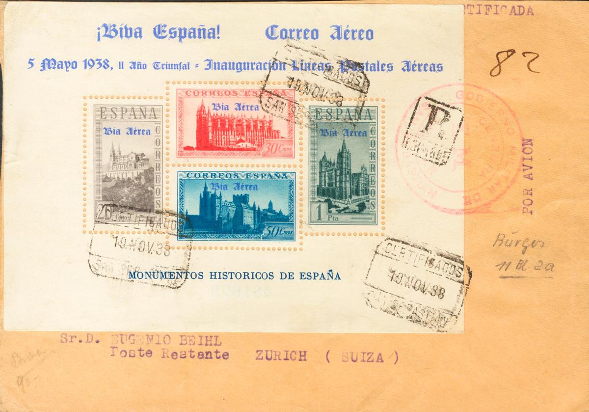 95. 1938. Hoja bloque. Certificado de SAN SEBASTIAN a ZURICH (SUIZA). Al dorso llegada. MAGNIFICA.