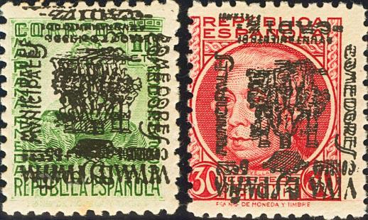 ★★ 4hhii, 8hhii. 1936. 10 cts verde y 30 cts carmín. DOBLE SOBRECARGA INVERTIDA. MAGNIFICOS. Edifil 2017: 66,5 Euros