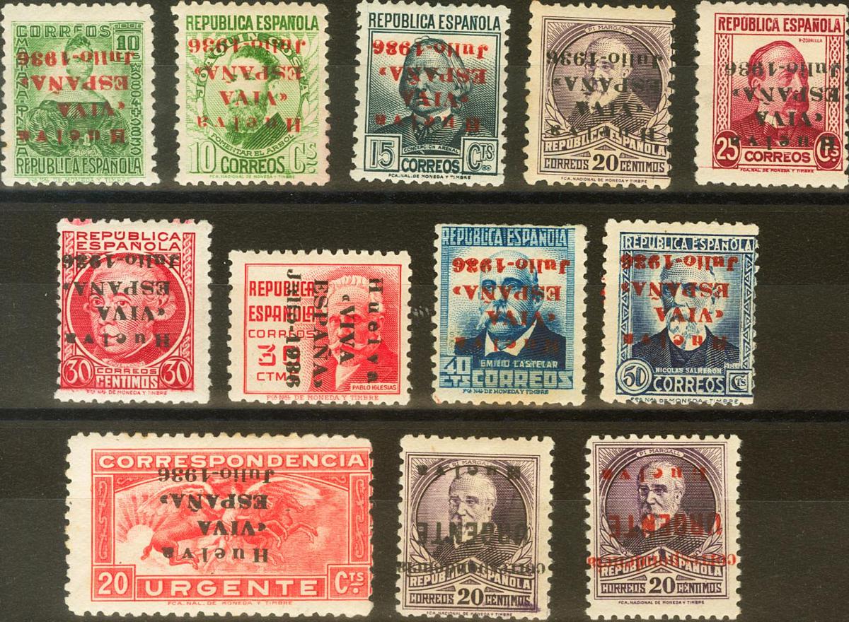 ★★/★ 5/12hi, 17/18hcci. 1937. Serie completa, a falta del 1 pts negro, 2 pts azul y 10 pts castaño (conservación habitual). SOBRECARGA INVERTIDA. MAGNIFICA.
