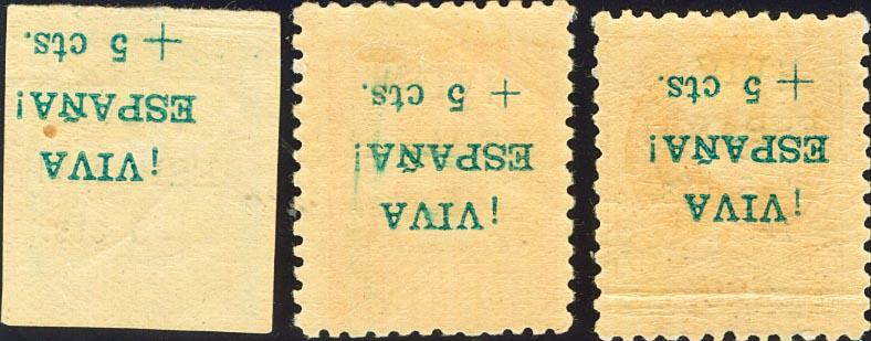★ 20hri, 21hri, 26hri. 1936. 5 cts sobre 1 cts, 5 cts sobre 2 cts y 5 cts sobre 20 cts. SOBRECARGA INVERTIDA, impresa al dorso. BONITOS. Edifil 2017: 40 Euros