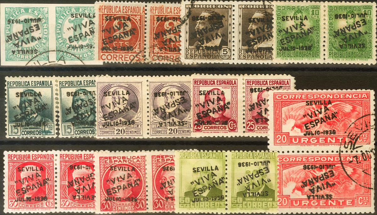 ★/ 1/9hphi,12hphi,17hphi. 1936. Conjunto de once valores en pareja (15 cts gran parte del dentado desprendido), UN SELLO SOBRECARGA INVERTIDA. BONITA.