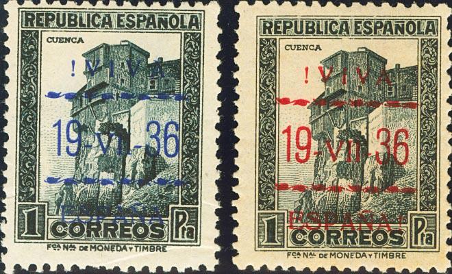 ★★ 15hcc, 15hcca. 1937. 1 pts negro, dos sellos. CAMBIO DE COLOR EN LA SOBRECARGA, en azul y en rojo (Tipo I). MAGNIFICOS. Dictamen GRAUS.