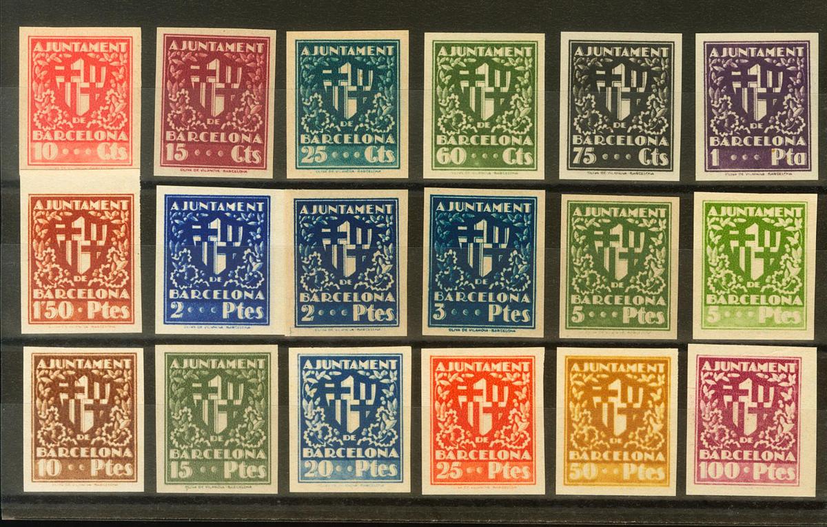 (★)(1939ca). Conjunto de doce ENSAYOS DE COLOR (sin dentar), de un diseño no adoptado, con valores entre 10 cts y 100 pts. MAGNIFICOS Y RAROS.
