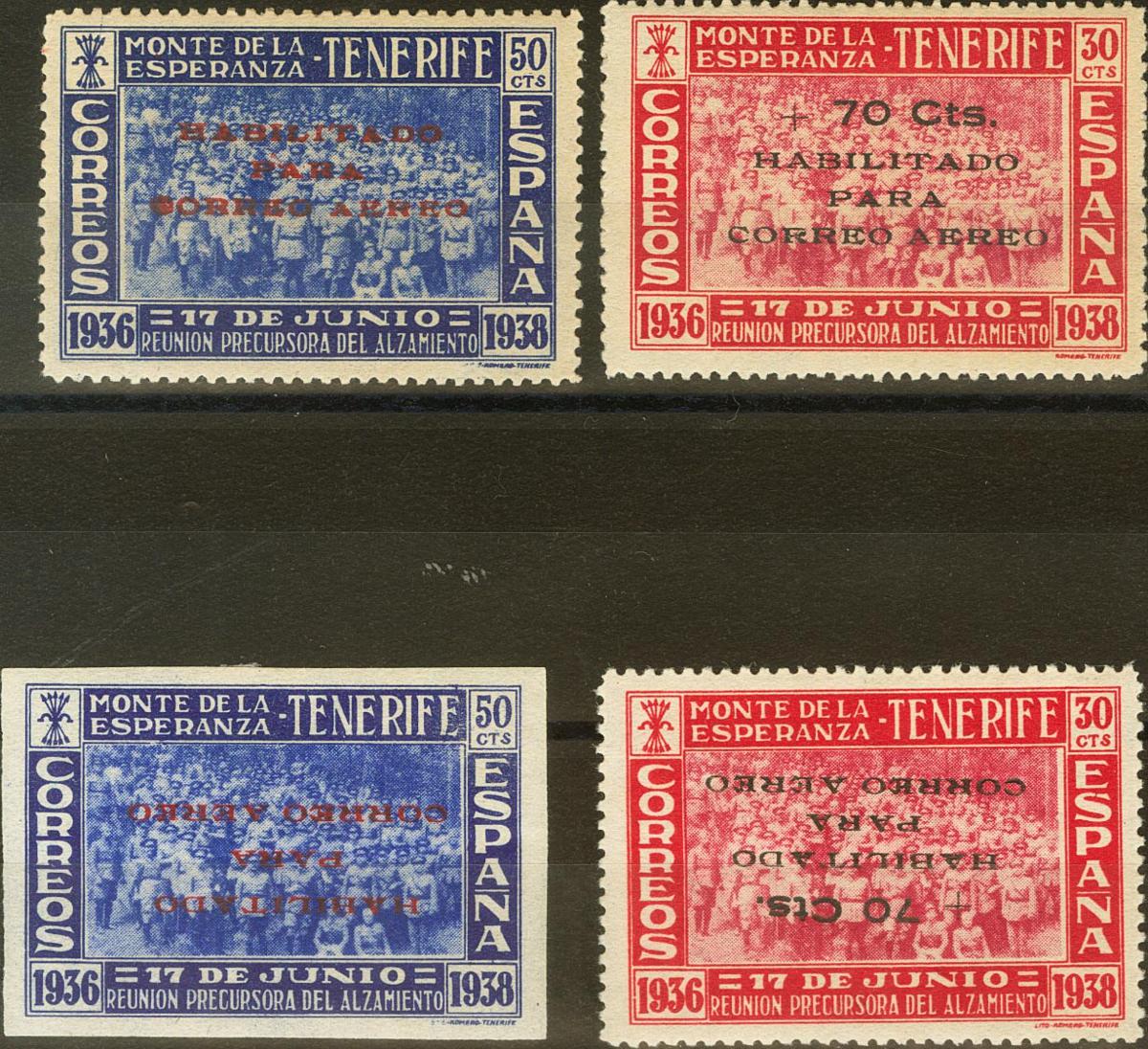 ★★/★ 56/57, 56his, 57hi. 1938. Dos series completas, sobrecarga normal e invertida (en la invertida el 50 cts ultramar sin dentar). MAGNIFICAS. Edifil 2017: 72 Euros