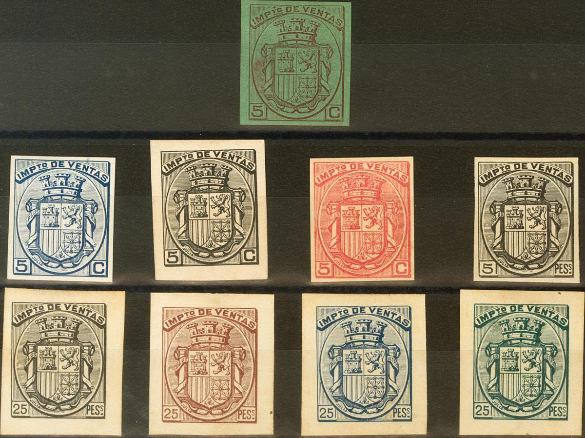 (★)1874. Juego completo de nueve ENSAYOS DE PLANCHA (sin dentar), sobre cartulina de IMPUESTO DE VENTAS. MAGNIFICO Y RARO CONJUNTO. (Alemany P-1/9)