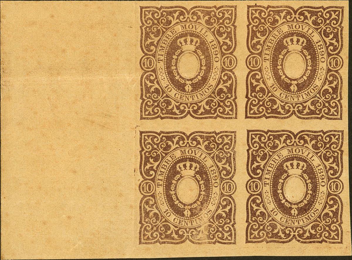 (★)1890. 10 cts castaño rojo TIMBRE MOVIL, bloque de cuatro (dos sellos pliegue horizontal). ENSAYO DE COLOR, de un diseño no adoptado. BONITO Y RARO. (Alemany P-19, Gálvez F58)