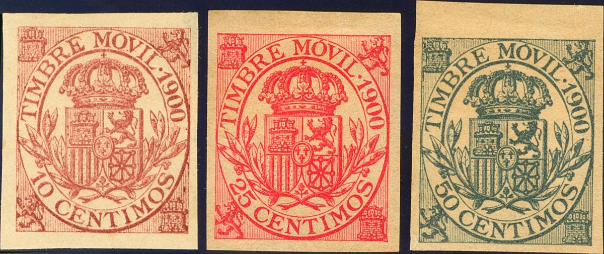 (★)1900. 10 cts castaño lila, 25 cts rosa y 50 cts verde azul TIMBRE MOVIL (1900). SIN DENTAR. MAGNIFICOS Y MUY RAROS. (Alemany 60s, 62/63s)