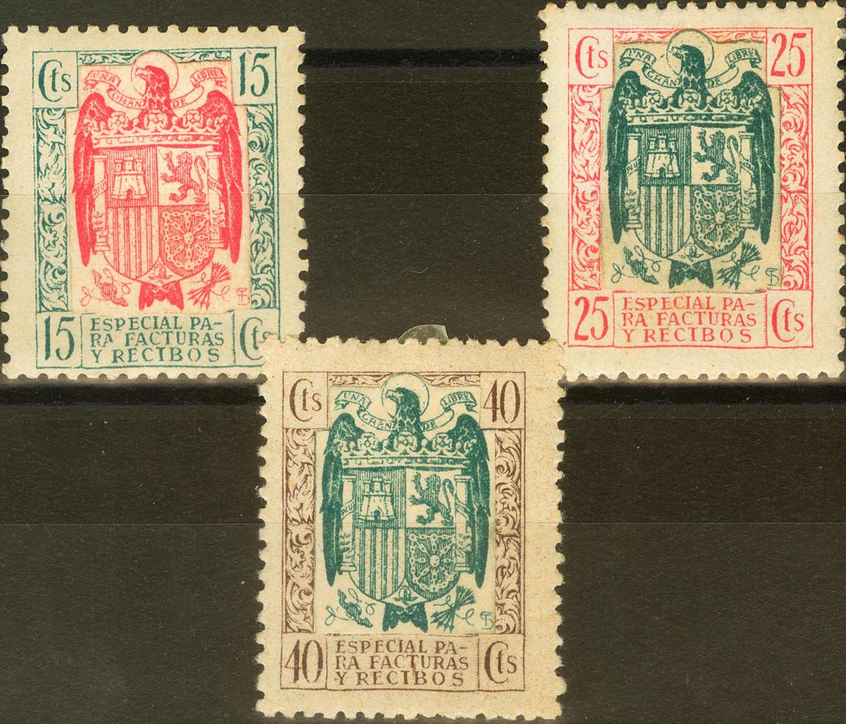 ★1939. 15 cts verde y rojo, 25 cts rosa y verde y 40 cts castaño y verde FACTURAS. PRUEBAS DE COMPOSICION (sobre papel cartón, el escudo adherido sobre los marcos). MAGNIFICOS Y RAROS.