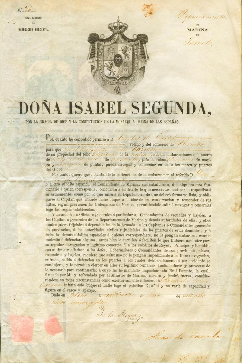 1866. Diversos valores de POLIZAS de 1867, 1870, 1873, 1876, 1879 y 1883 sobre documento de Real Patente de Navegación Mercantil del Departamento de Marina de El Ferrol otorgado al Bergantín-Goleta Carmen por la Reina Isabel II, firmado en Palacio YO LA REINA en Enero de 1866, esta Patente debía llevar tantos sellos, por valor de setenta reales de vellón, como periodos de tres años desde la fecha de expedición, las pólizas de 1883 corresponden a un cambio de propietario del buque (manchas de celofán en los bordes interiores, sin importancia). MAGNIFICO Y RARISIMO, ESPECTACULAR DOCUMENTO.
