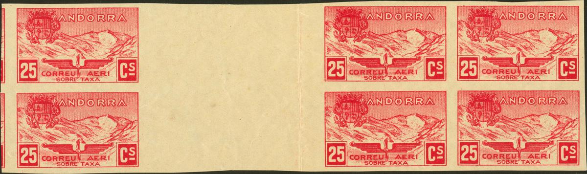 ★★/★ NE13s(6). 1932. 25 cts carmín, bloque de seis con INTERPANEL. NO EMITIDO y SIN DENTAR. MAGNIFICO Y RARO.