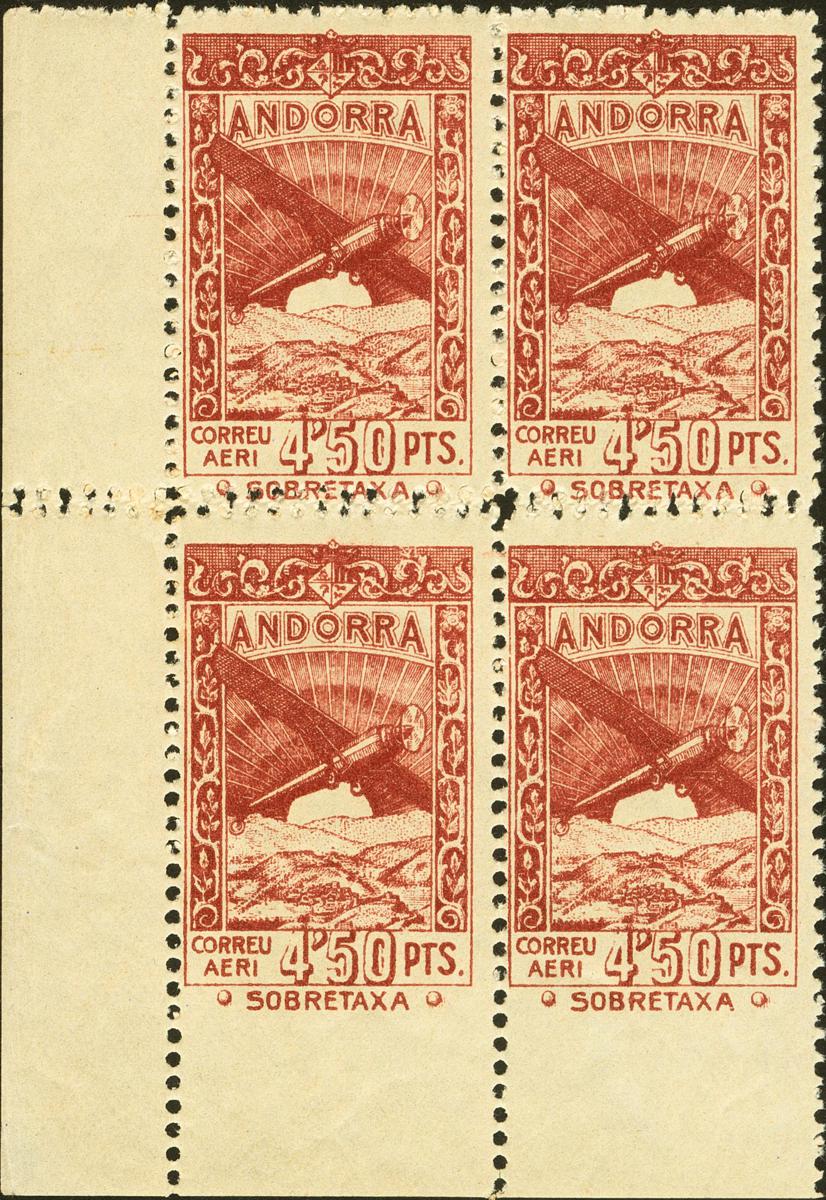 ★★ NE23(4). 1932. 4´50 pts castaño NO EMITIDO, bloque de cuatro, esquina de pliego. DOBLE DENTADO HORIZONTAL ENTRE LOS SELLOS y SIN DENTAR EL MARGEN INFERIOR. MAGNIFICO Y RARO.
