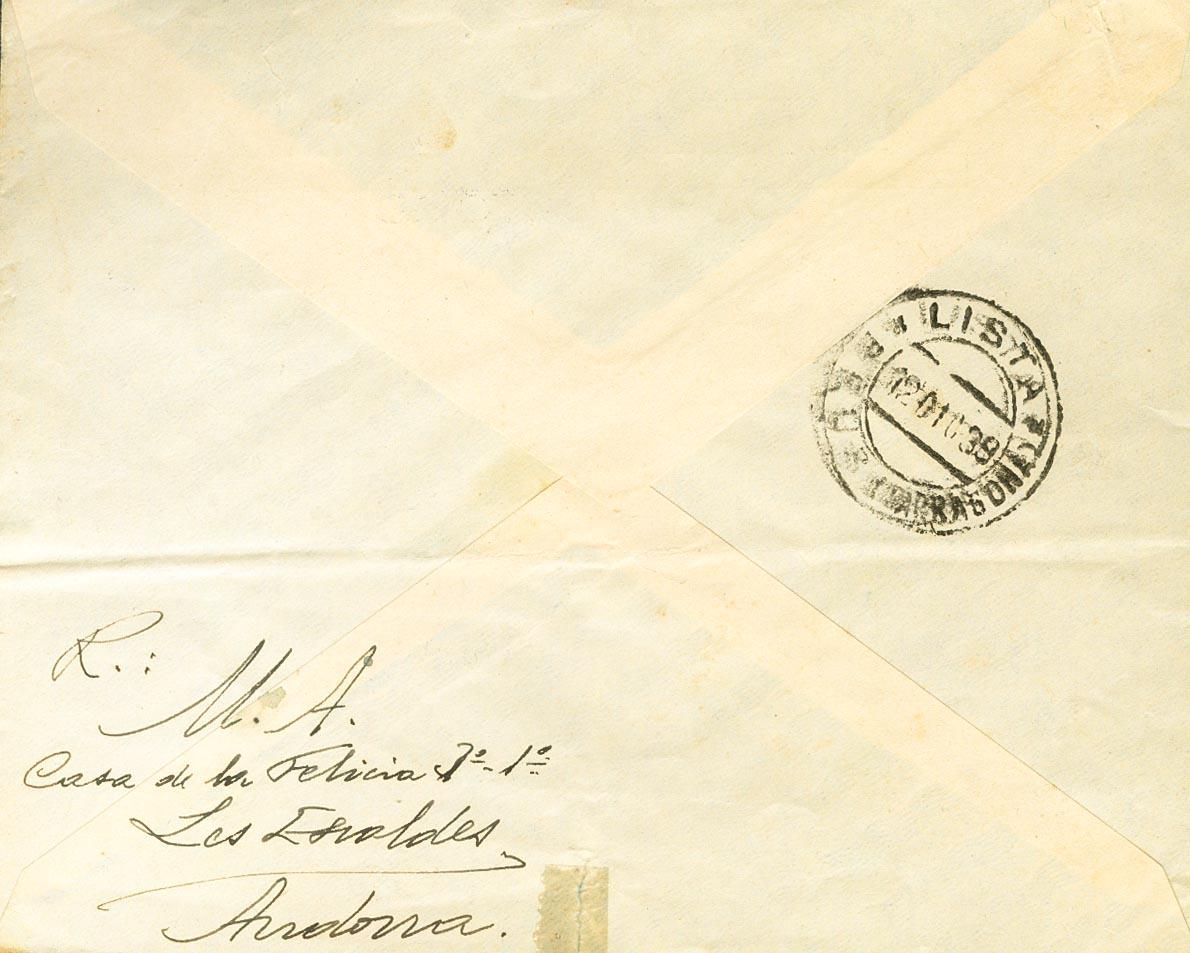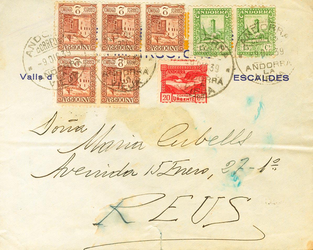 28(5), 33(2), 44. 1939. 2 cts castaño, cinco sellos, 15 cts verde amarillo, dos sellos y 20 cts rojo. ANDORRA LA VIEJA a REUS. Al dorso llegada. BONITA.