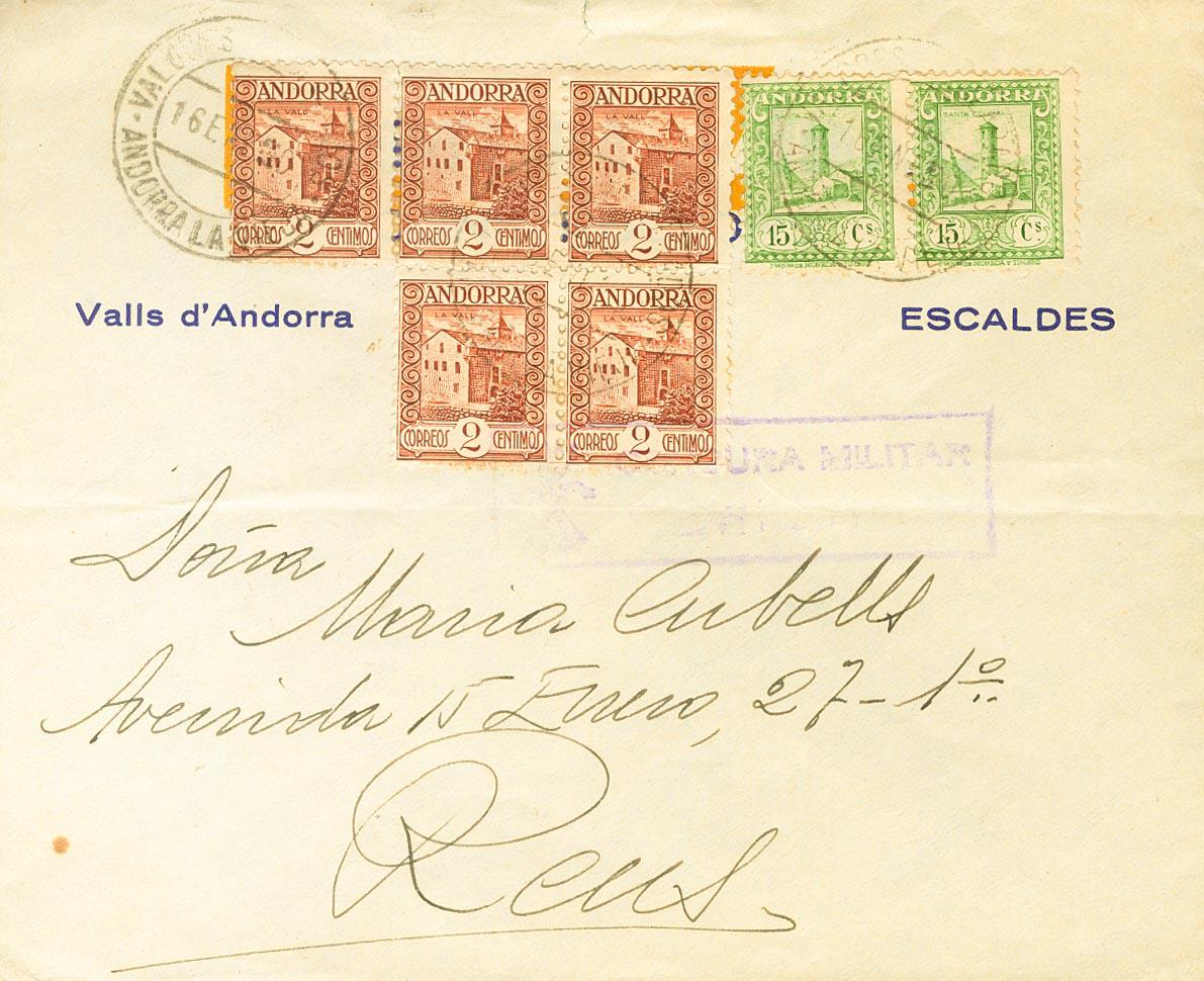 28(5), 33(2). 1940. 2 cts castaño, cinco sellos y 15 cts verde amarillo, dos sellos. ANDORRA LA VIEJA a REUS. Al dorso llegada. MAGNIFICA.