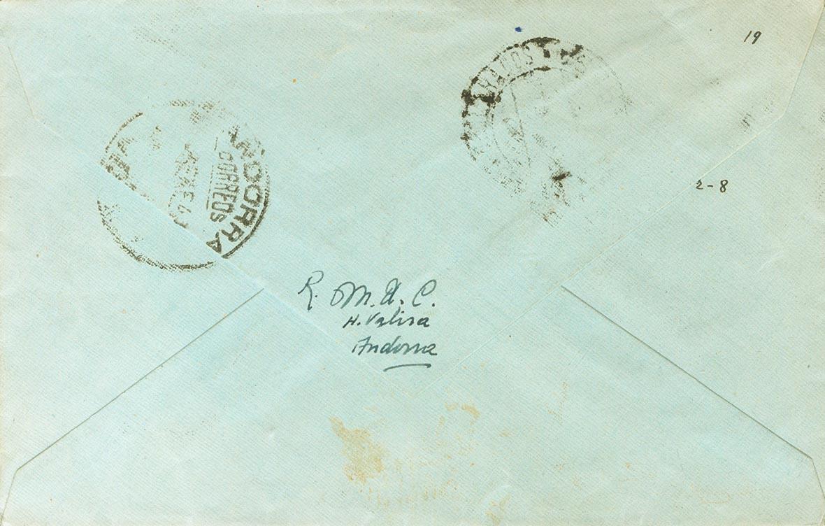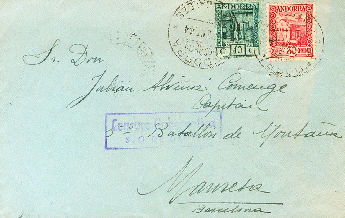 30, 36. 1944. 10 cts azul verdoso y 30 cts rosa-rojo. ESCALDES a MANRESA. Matasello ANDORRA / LES ESCALDES, al dorso llegada. MAGNIFICA.