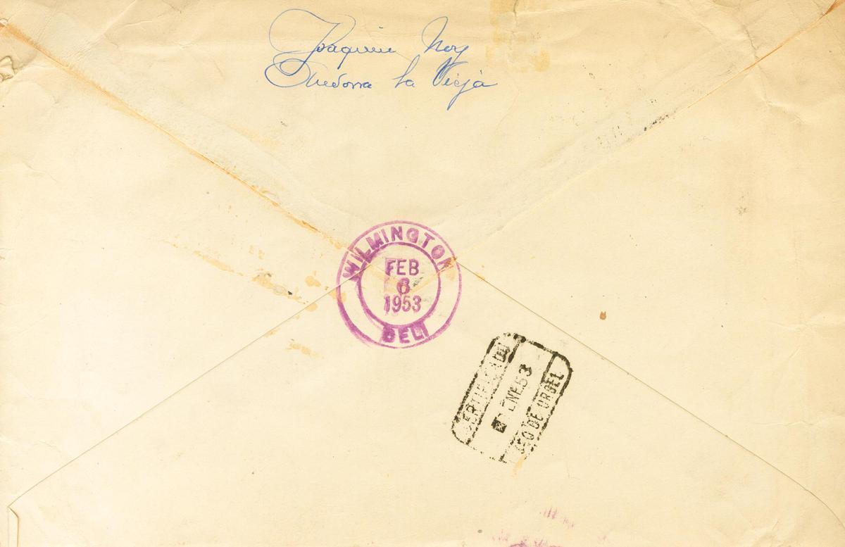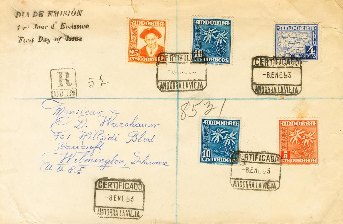 46, 47(2), 49, 56. 1953. 5 cts naranja, 10 cts azul, dos sellos, 25 cts naranja y 4 pts azul. Certificado de ANDORRA LA VIEJA a WILMINGTON (U.S.A.). Al dorso llegada. MAGNIFICA.