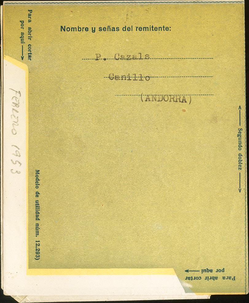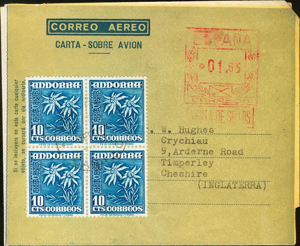 47(4). 1953. 10 cts azul, bloque de cuatro sobre Aerograma de España de 1´65 pts. CANILLO a TIMPERLEY (GRAN BRETAÑA). MAGNIFICO.