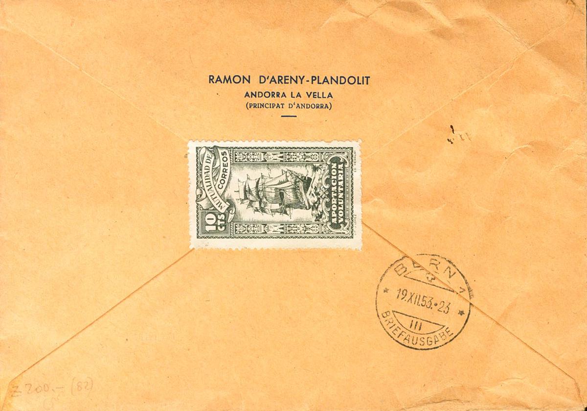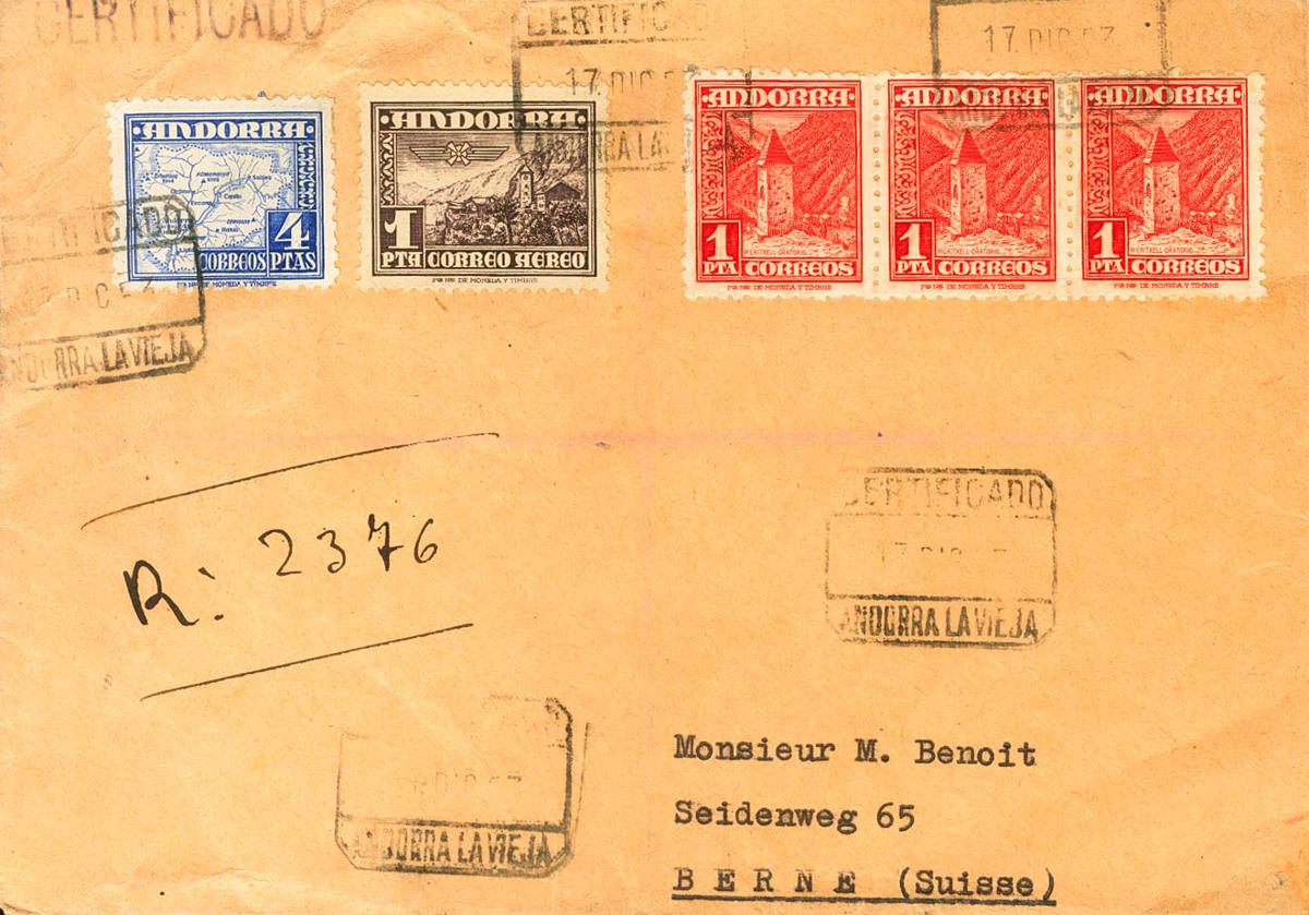 54(3), 56, 59. 1953. 1 pts bermellón, tres sellos, 4 pts ultramar y 1 pts violeta. Certificado de ANDORRA LA VIEJA a BERNA (SUIZA). Al dorso llegada. MAGNIFICA Y ESPECTACULAR.