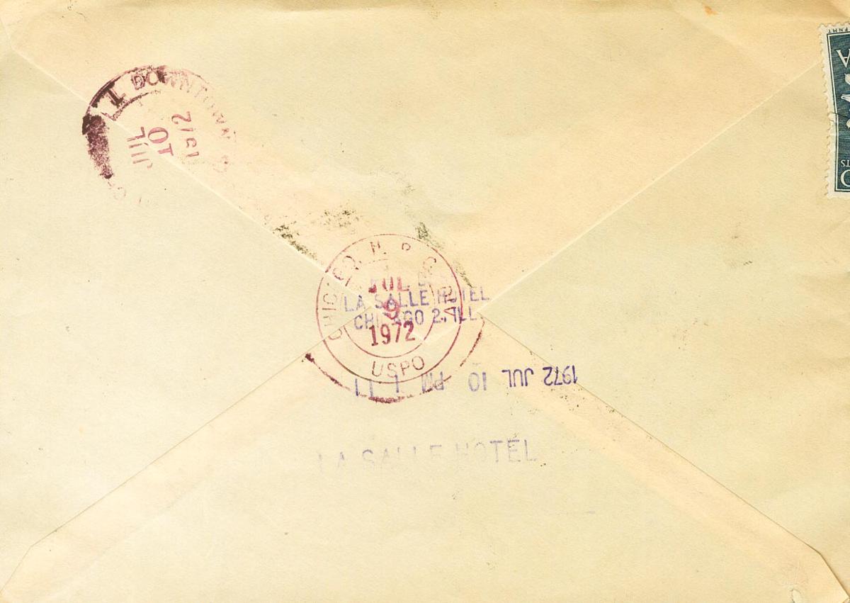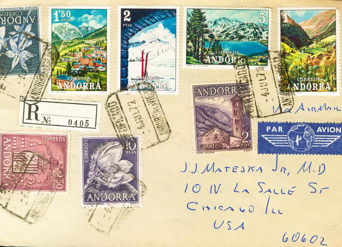 73/76. 1972. Serie completa y diversos valores. Certificado de ANDORRA LA VIEJA a CHICAGO (U.S.A.). Al dorso llegada. MAGNIFICA Y ESPECTACULAR.