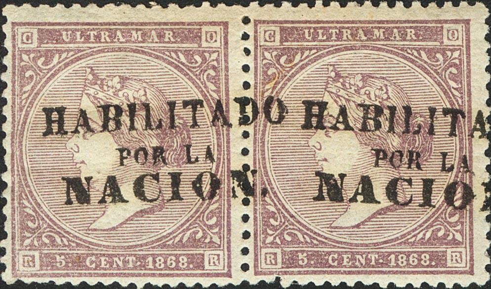★ 22A(2). 1868. 5 cts lila, pareja. HABILITADO / POR LA / NACION. MAGNIFICA. Edifil 2022: 200 Euros