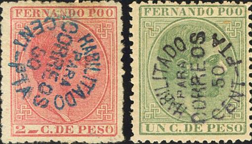 ★ 9Ahx, 10Ahx. 1884. 50 cts sobre 1 ctvo verde y 50 cts sobre 2 ctvos carmín. SOBRECARGA ACOSTADA, en azul. MAGNIFICOS Y MUY RAROS. Edifil 2018: 407 Euros