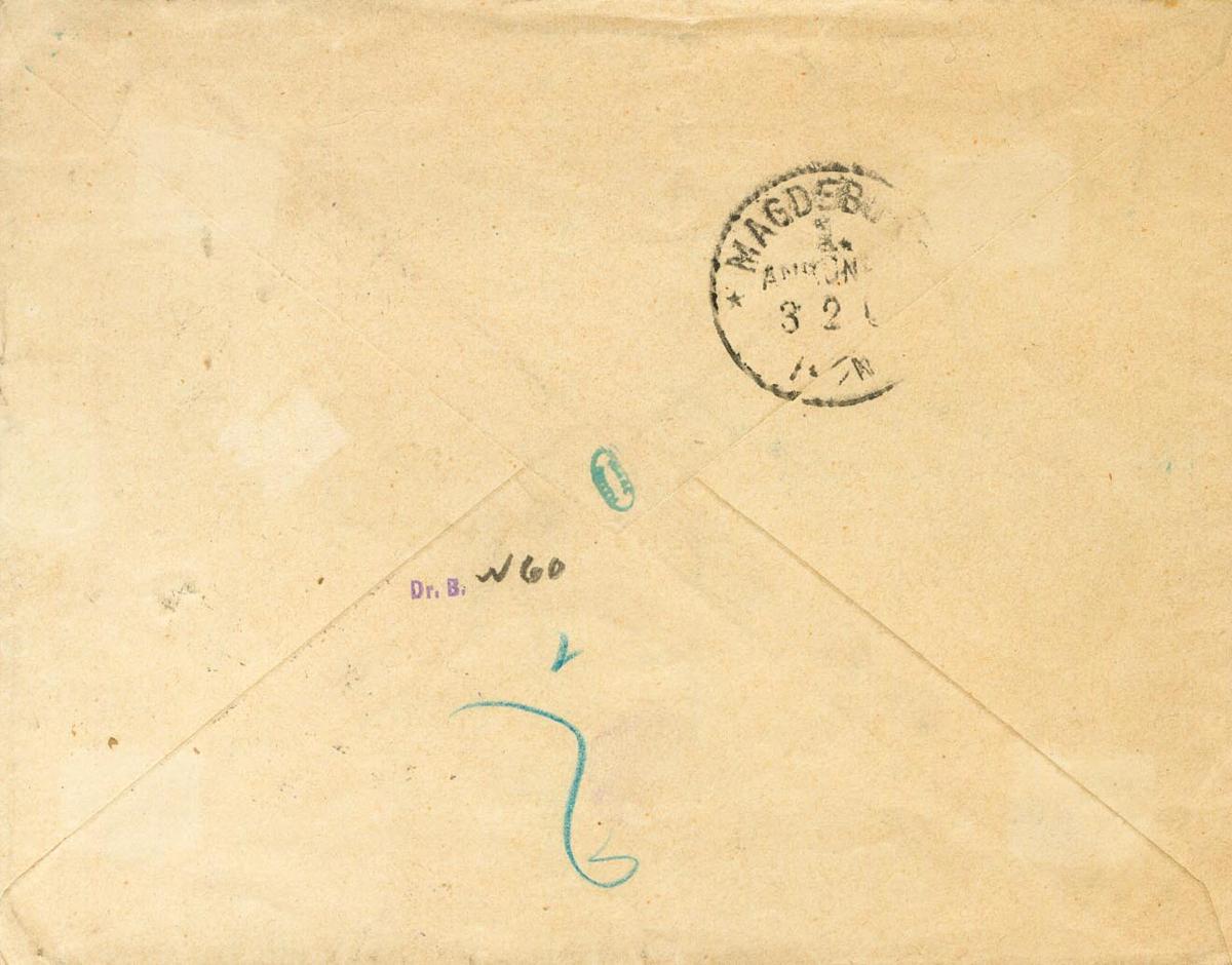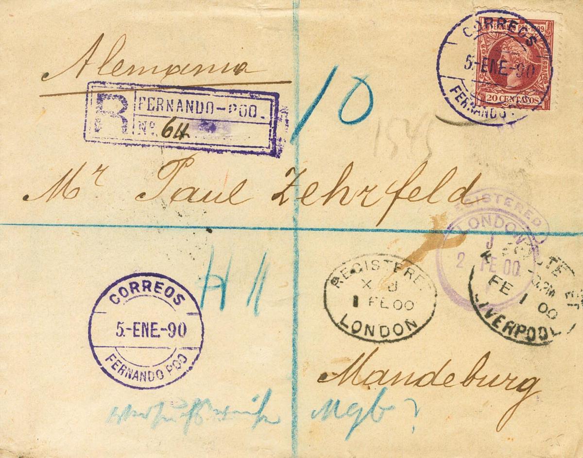 64. 1900. 20 ctvos carmín violeta. Certificado de FERNANDO POO a MAGDEBURG (ALEMANIA), circulada vía Liverpool y Londres. Error en el año del fechador "90" en lugar de "00" y al dorso llegada. MAGNIFICA.