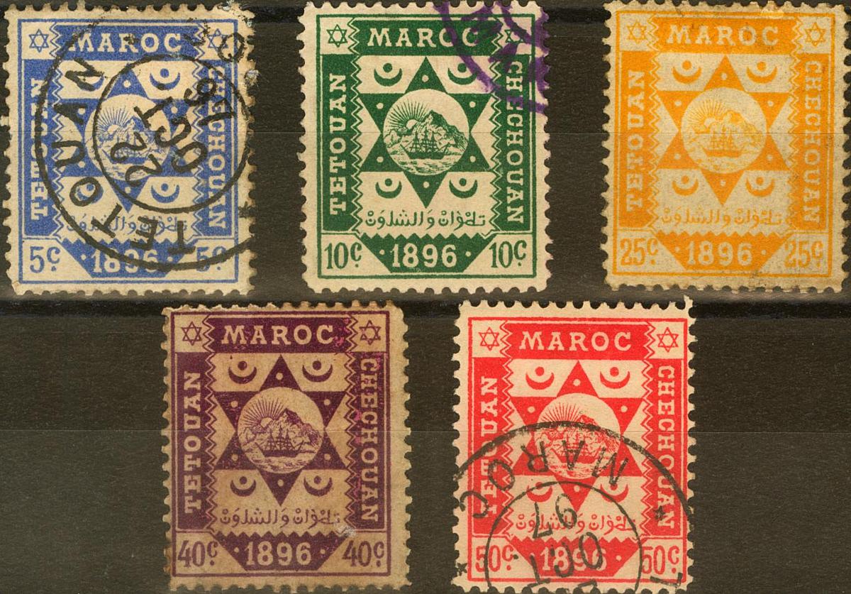 (★)/ 40, 41, 43, 44, 45. 1896. 5 cts azul, 10 cts verde, 25 cts amarillo, 40 cts violeta y 50 cts bermellón. TETUAN-XAVEN. BONITOS Y RAROS.